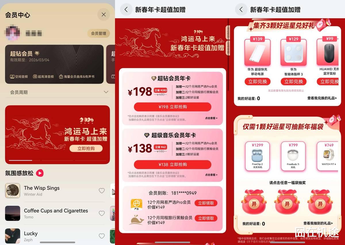 对了,华为音乐在春节期间还有不少会员福利活动:点开“我的”再进“会员中心”,就能看到“鸿运马上来”的活动页面。在这里,充会员年卡会赠送一年网易严选Pro会员和一年同程旅行黑鲸会员,还有额外的“好运星”,能用来抽福袋或者兑换礼物,华为FreeClip2、WATCH FIT 4等超多惊喜大奖等着你,赶快和我一起行动起来吧!
