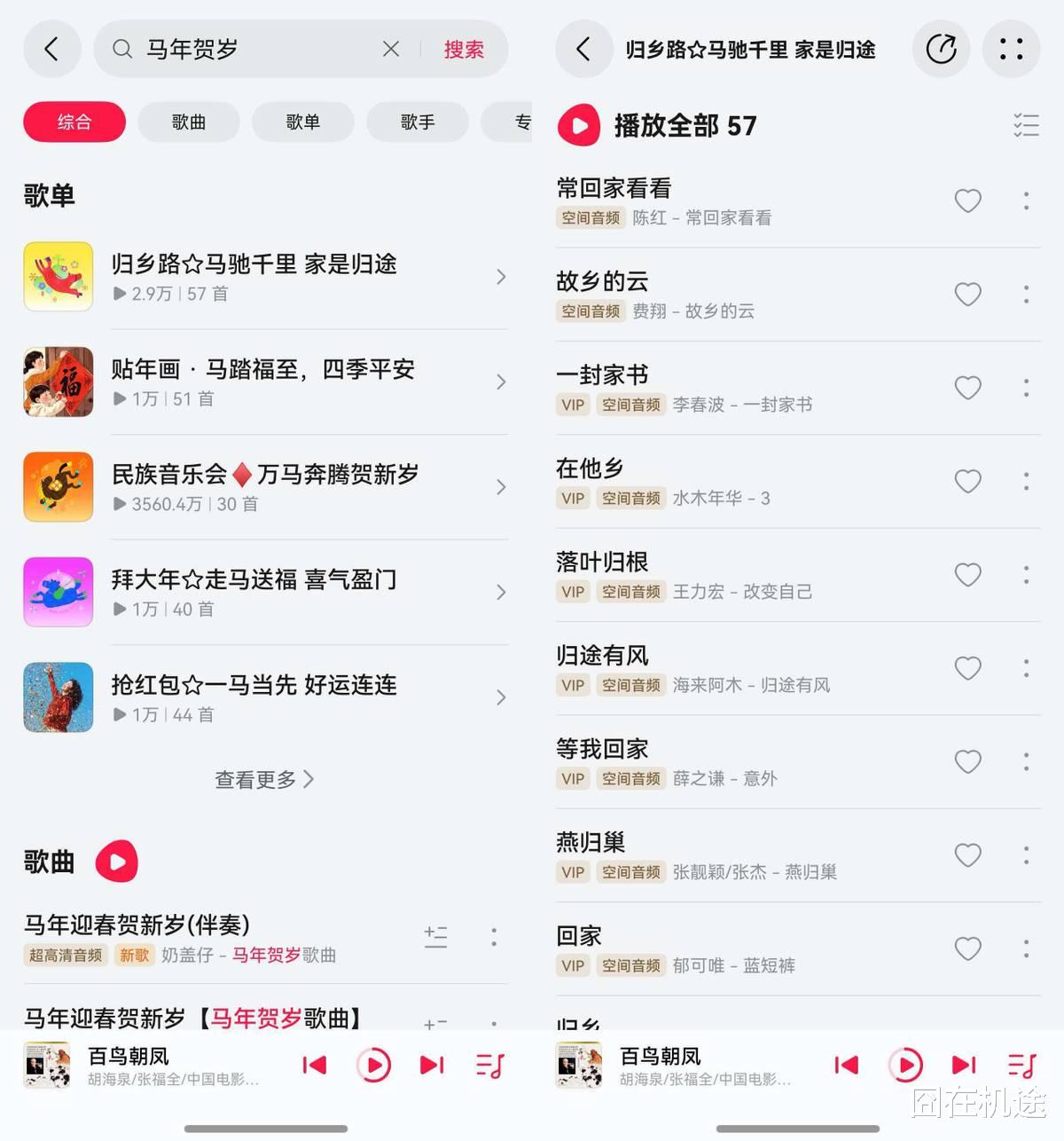 以前坐高铁回家,最头疼的就是找歌,总想找点应景一些的歌。今年没想到可以偷懒了,只要在华为音乐里搜“马年贺岁”,直接能找到一大堆新年主题歌单。从“归乡路”到“迎财神”,一整个春节的歌都安排好了,连“贴年画”、“抢红包”这种具体小场景都考虑到了。正好我在回家路上,直接点开“归乡路·马驰千里,家是归途”这个歌单,从《故乡的云》到《落叶归根》再到《燕归巢》,这些经典曲目真的太戳我了,那些曾经的时光历历在目,好在马上就能回家和爸妈还有儿时的小伙伴一起过年了!