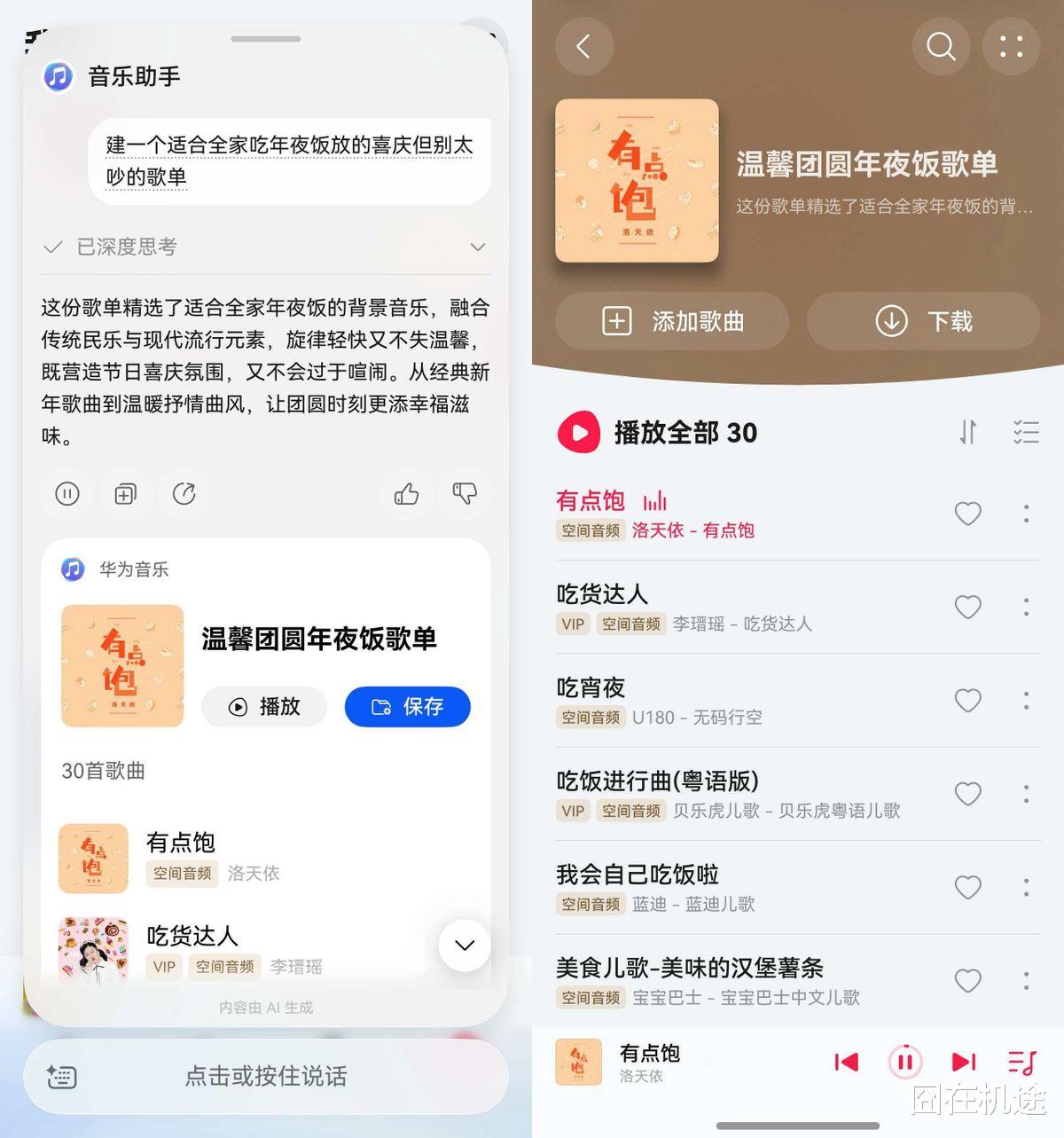如果你想要找到春节假期里更多场合听的歌,那“音乐助手”绝对能让你省不少心。以前筹备家里过年聚会,总要放点背景音乐,但来来回回也就那么几首歌,其他的父母听不惯。这次我直接找到音乐助手,说一句:“建一个适合全家吃年夜饭放的、喜庆但别太吵的歌单。”没几秒钟就给我生成了一个歌单列表,这一播放,我父母都觉得很满意!