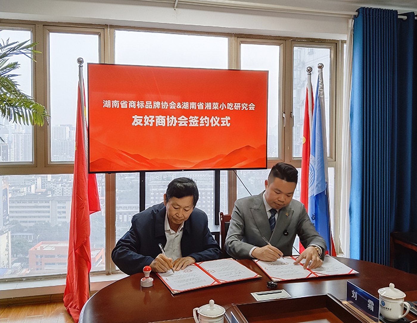 座谈会上,协会办公室主任刘霜向丁治平一行详细汇报了协会的发展历程、党建工作、组织架构、内部治理、主要工作内容和工作目标,并重点介绍了协会助力县域乡村振兴品牌建设和“湖南省知名商标品牌”的认定工作。随后,湖南省商标品牌协会与湖南省湘菜小吃研究会签订了友好协会框架战略合作协议,双方一致表示,将以此次交流为契机,进一步加强沟通与合作,在内部治理、社会公益、党建工作保持常态化交流,积极探索在行业标准研究、湘菜小吃榜单、人才培训及服务体系建设等方面的合作路径。