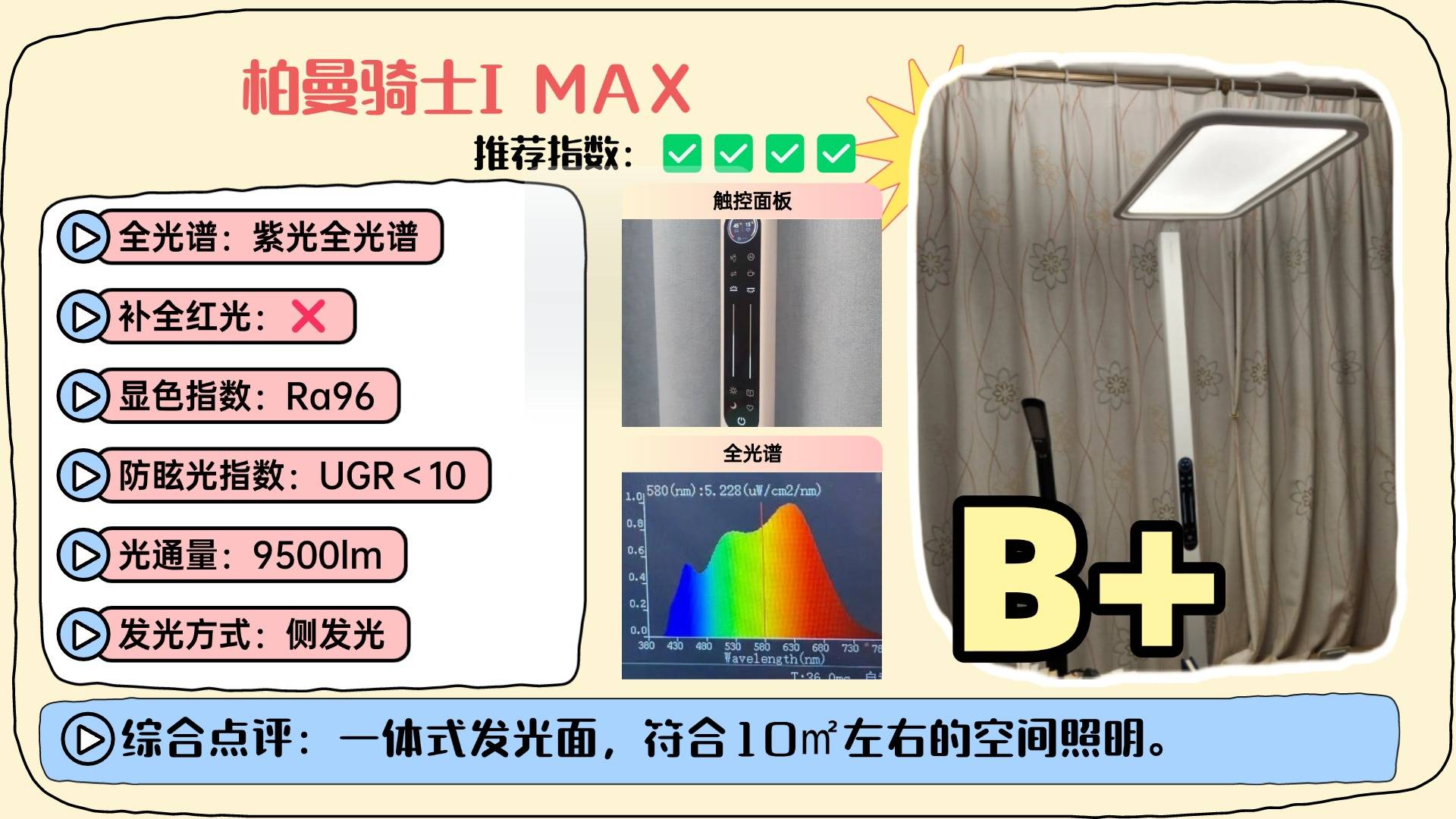 护眼效果:在光源上,柏曼骑士I MAX采用全光谱方案,并引入紫光激发技术,从源头控制有害蓝光输出,同时让光谱分布更加完整、平滑。实际观感上光线明亮且不刺眼,整体舒适度较高,显色指数稳定在Ra98左右,对文字阅读、书写以及绘画等精细用眼场景都比较友好。