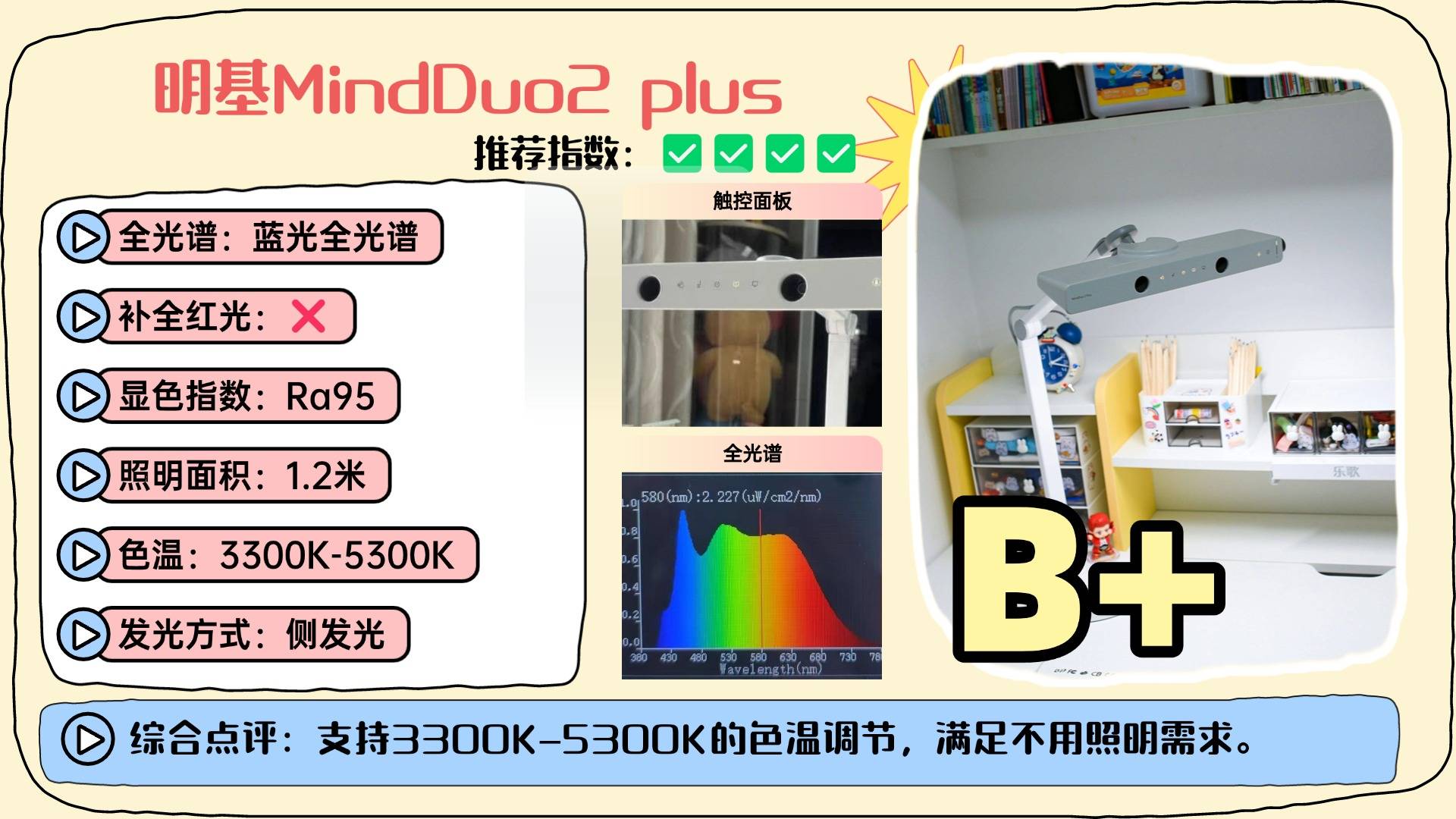 性能配置:明基MindDuo2 Plus具备Ra95左右的显色指数,同时设计上采用鸥翼形灯头结合多片式反光板,将侧发光的光线向桌面两侧展开,光线过渡自然,能在约120cm的桌面范围内形成比较均匀的照明环境。