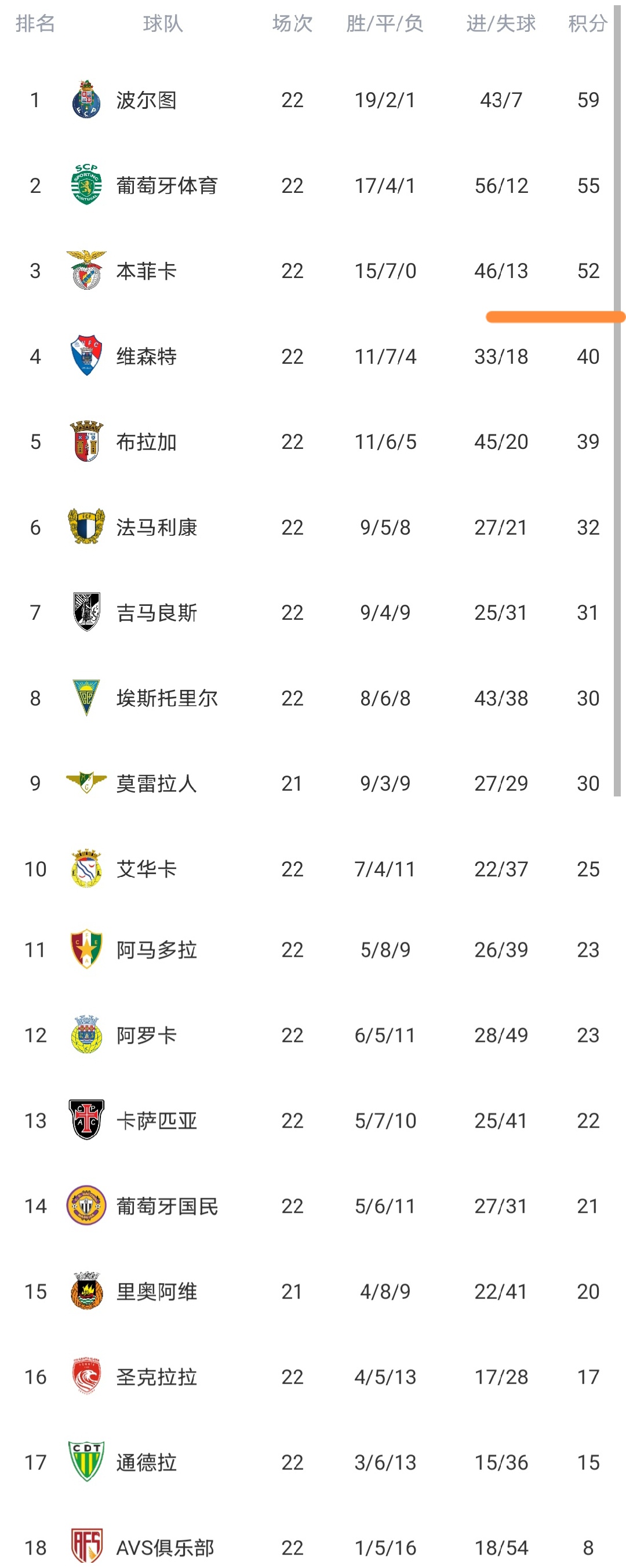 可以看到波尔图队击败葡萄牙国民之后,积分上涨到了59分,继续排名第一,领先穆帅执教的本菲卡队7分。而葡萄牙体育队击败法马利康队之后,积分上涨到了55分,距离榜首4分,同时领先穆帅执教的本菲卡队3分。而AVS俱乐部击败埃斯托里尔队之后,积分上涨到了8分,继续垫底,落后第17的通德拉队7分。此外葡萄牙国民队积21分排名第14,埃斯托里尔积30分排名第8,法马利康积32分排名第6。可以看到穆帅仍有希望率领本菲卡队夺冠,只是夺冠难度有些大。