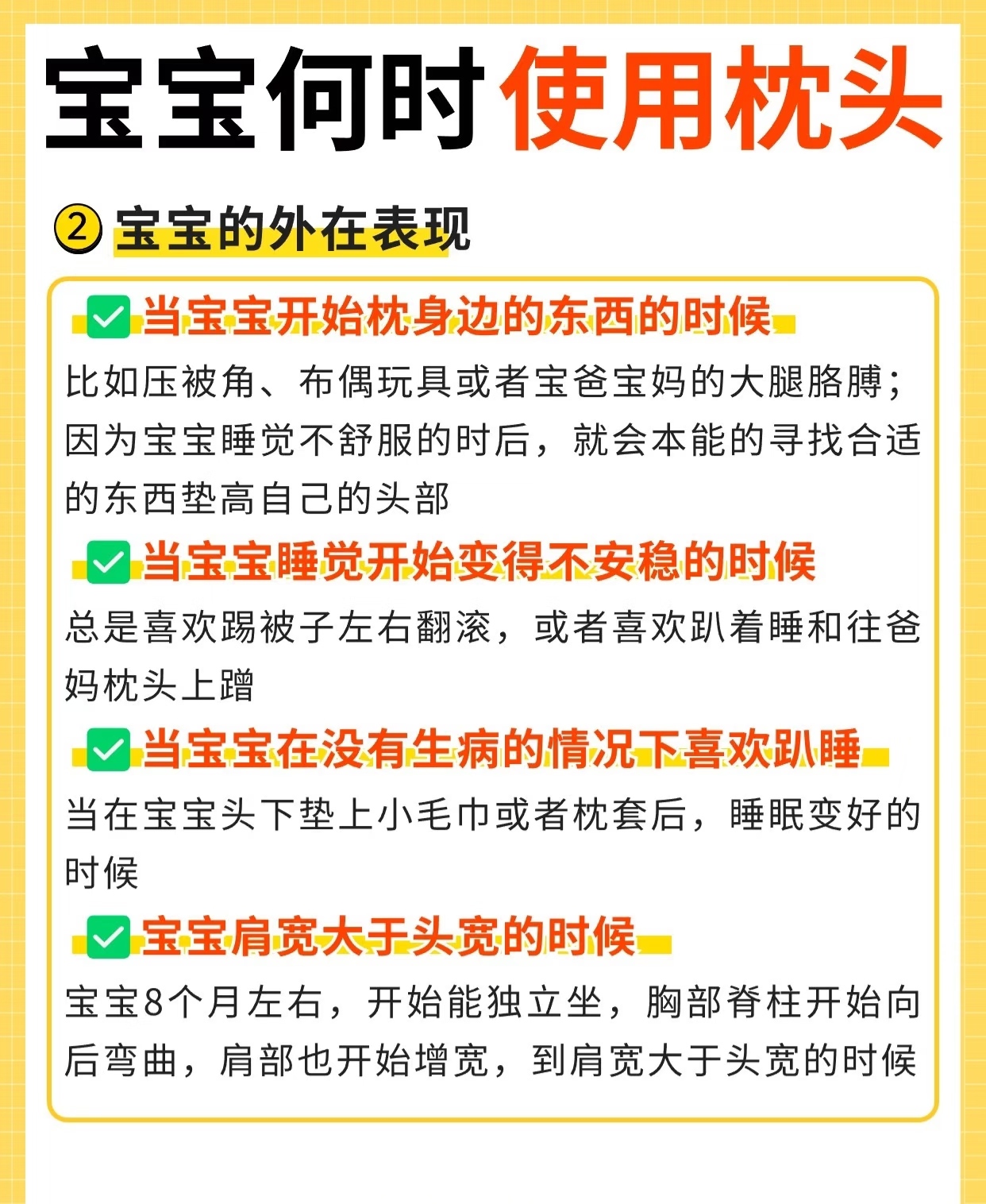 那么,什么时候可以开始考虑给宝宝用枕头呢?通常是在1岁以后。但更重要的是,观察宝宝是否发出了这些“需求信号”: