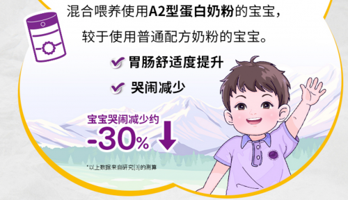 针对这点,官媒也科普道,母乳是婴幼儿最理想的天然食物。若母乳不足或无法纯母乳喂养,可选择“混合喂养”,即母乳+配方奶粉的模式。另一项发布在食品科学与营养领域专业学术期刊Food Science and Nutrition 的《不含A1型β-酪蛋白的婴儿配方奶对生长发育和舒适度的影响:一项随机对照试验》重要研究,显示混合喂养使用仅含A2型蛋白的a2奶粉宝宝,较于使用普通奶粉的宝宝,胃肠舒适度更佳、哭闹次数减少约30%。主导这个研究的上海交通大学医学院附属新华医院发育行为儿童保健科盛晓阳主任医师也提示到:“在混合喂养的过程当中,妈妈们都要记得,除了我们要注意配方奶当中的营养成分跟母乳类似,同时还要注意配方奶当中的成分结构也要跟我们的母乳类似。”
