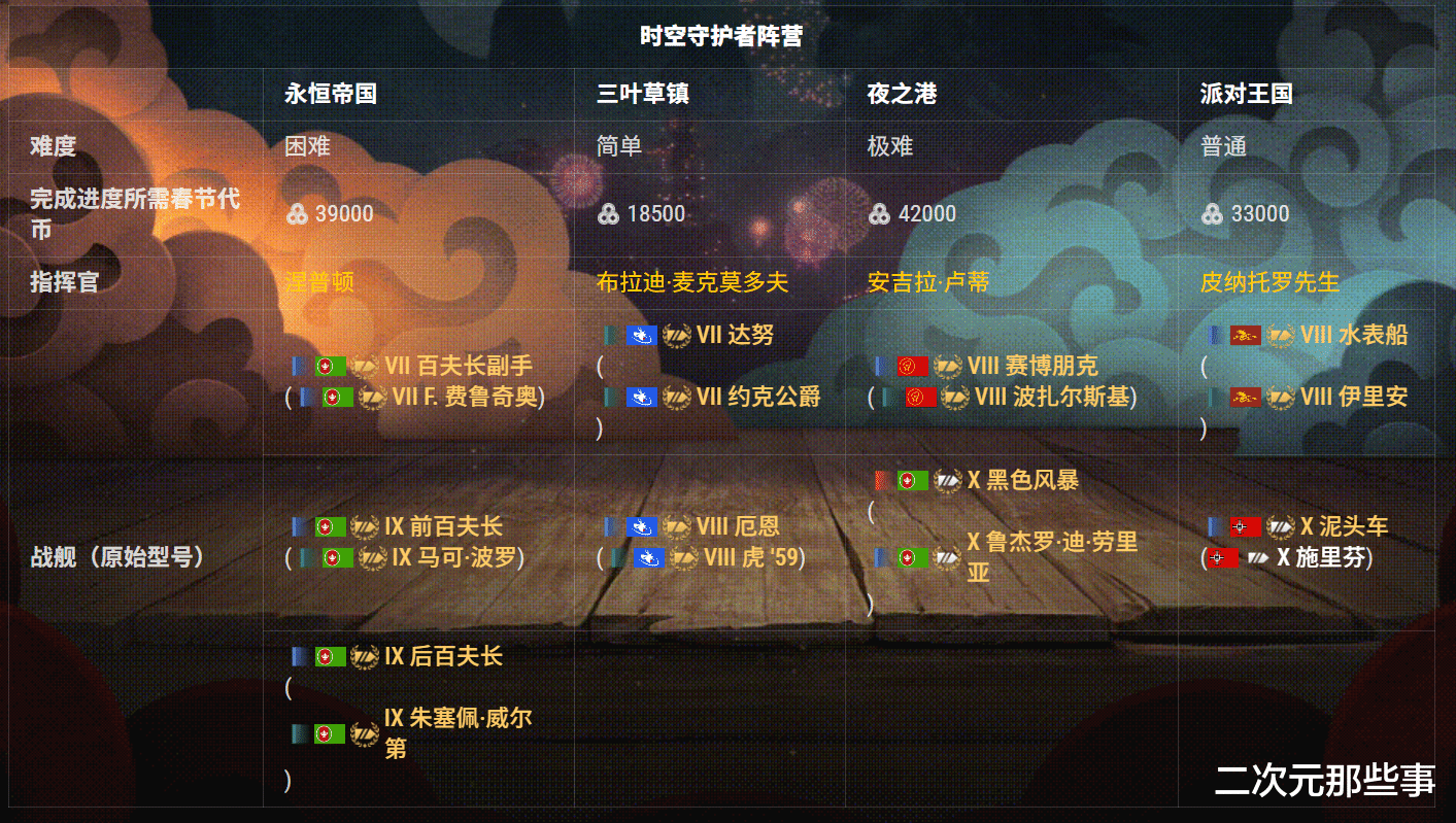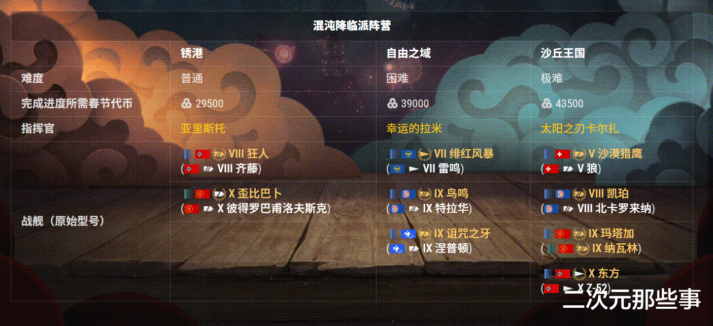 两大阵营分为时空守护者和混沌降临派,其中前者含三叶草镇、永恒帝国、夜之港三大派系。后者也有对应难度派系,分别是锈港、自由之域和沙丘王国。有简单、困难和极难三个难度,所需的春节代币数量也不一样。