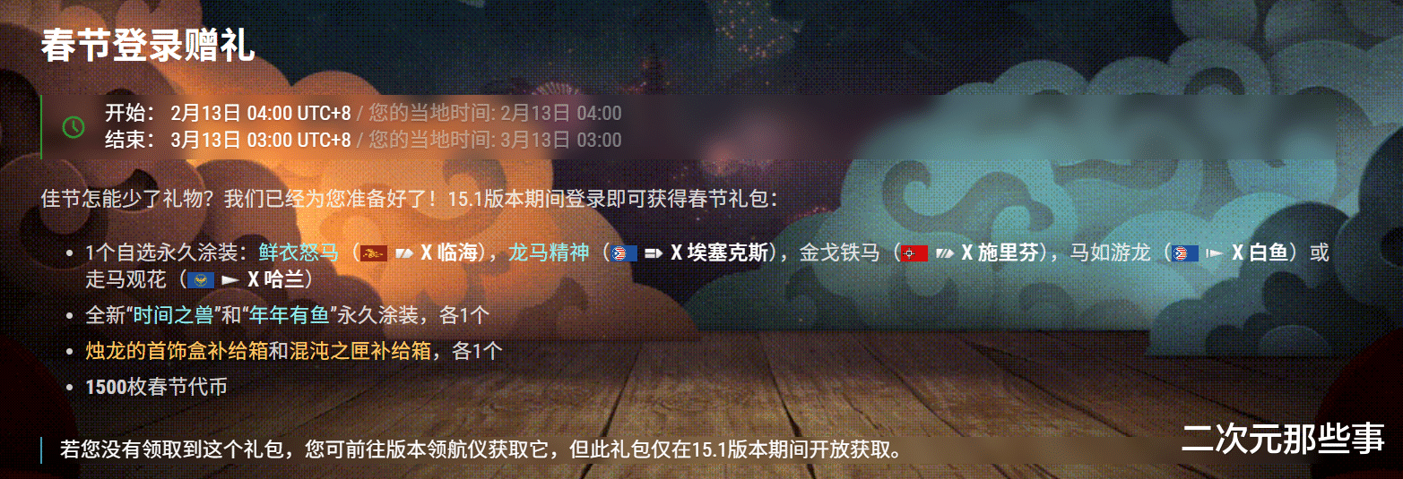 除了年兽悖论和开箱活动活动外,春节版本福利也非常丰厚。在2月13日-3月13日期间登录,即领自选马年永久涂装、两款补给箱与1500新春代币;2月17日-3月4日节日日历每日翻牌得高级账号、煤炭,错过可次日补领。