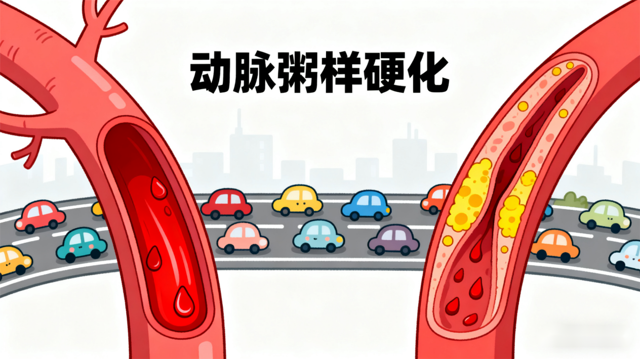想象一下家里的水管,用久了内壁会生锈、结水垢,管道会变窄,水流就不畅了。我们的血管也是如此,衰老、高血压、高血糖、高血脂、吸烟、不良饮食习惯等,都会损伤血管内壁,导致胆固醇等物质沉积下来,形成像粥一样的斑块(动脉粥样硬化),使血管壁变硬、管腔变窄。