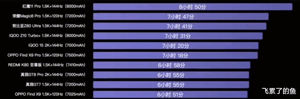 这样的表现也验证了小白测评极限续航测试的情况,努比亚Z80 Ultra的续航表现仅次于8000mAh的红魔11 Pro和同为7200mAh的荣耀Magic8 Pro,排名第3,极限续航时长达到7小时41分,这样的表现可以说是相当哇塞了!(数据图片引自小白测评,侵删)