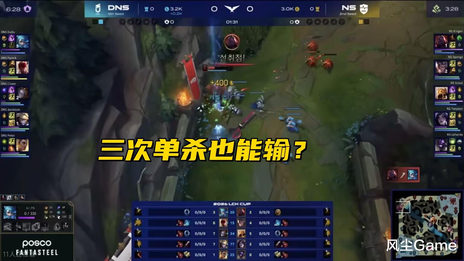 在先赢一局的情况下,NS被DNS连追两局,最终DNS实现一穿二,拿下第五个季后赛名额,这场BO3是有点变态的,两队都有那种很逆天的操作,尤其是决胜局,Kingen先选塞恩,Dudu锁下格温Counter,结果比赛才1分30秒,格温就被对位单杀,到4分半的时候,单杀的剧情再次上演。