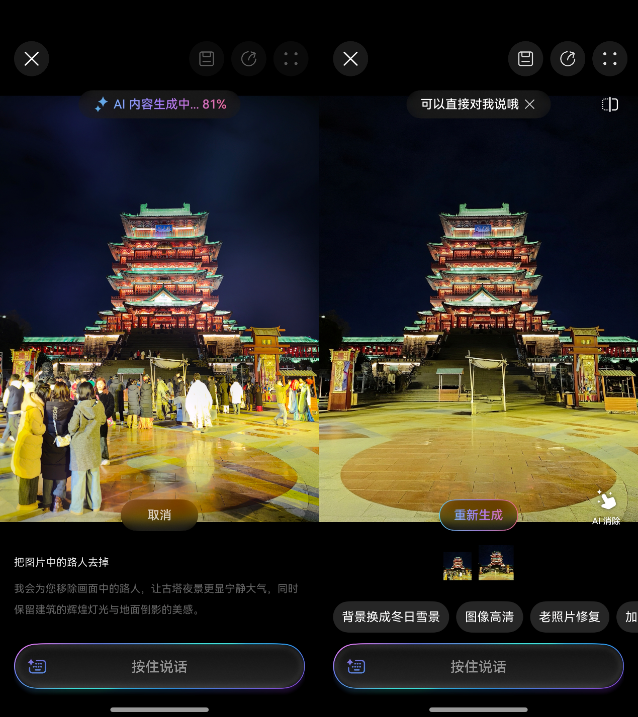 春节和家人出游,当然少不了景点留念,但是照片总有其他游客乱入,怎么办?可以试着交给小艺来处理!在图库中选中想修的照片后长按导航条唤醒小艺,直接说“把图片中的路人去掉”。不过几秒钟,小艺就“交作业”了,那些不相干的路人就消失了,画面一下子变得干净又完整,完全看不出修图的痕迹。