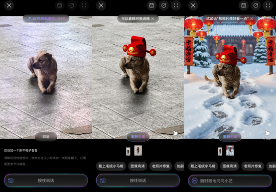 除了能“消除路人”外,我用小艺修图智能体还摸索出了很多好玩的效果。比如,我给家里小狗拍照片,让小艺“给它加个新年帽子看看”。小狗头上就多了一顶红色毛线帽,特别可爱。觉得背景普通,就说“换成下雪的春节街景”,马上就有雪花和灯笼,氛围感瞬间拉满。另外一句话还能添上年宵花、春联这些装饰,比手动贴图方便太多。