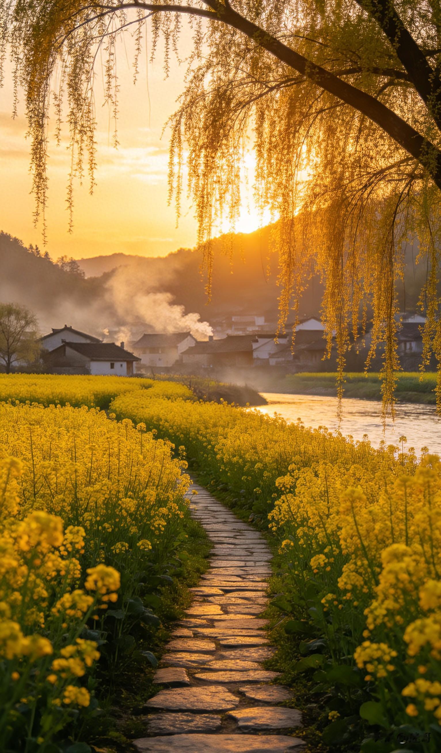 远山、村落、花田、垂柳,在落日余晖中构成一幅绝美的水墨画卷,美得让人心安。