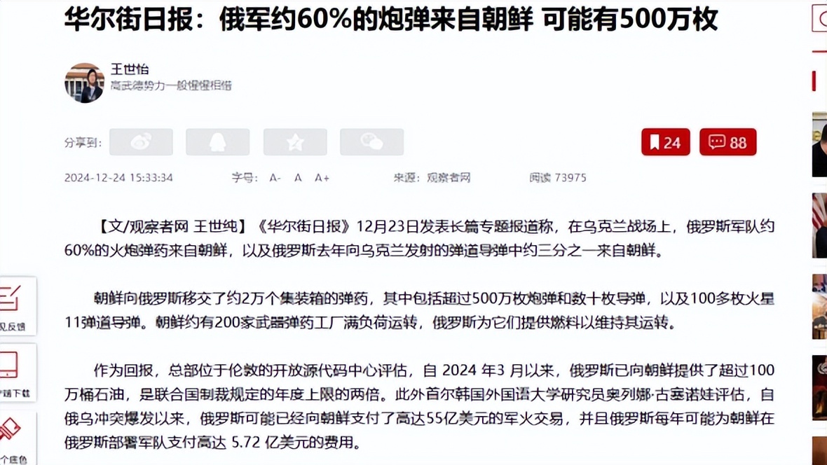 乌克兰情报部门透露,过去两年间,朝鲜时断时续地向俄罗斯输送650万枚炮弹,这在一定程度上帮助俄军在前线化解了不少压力。