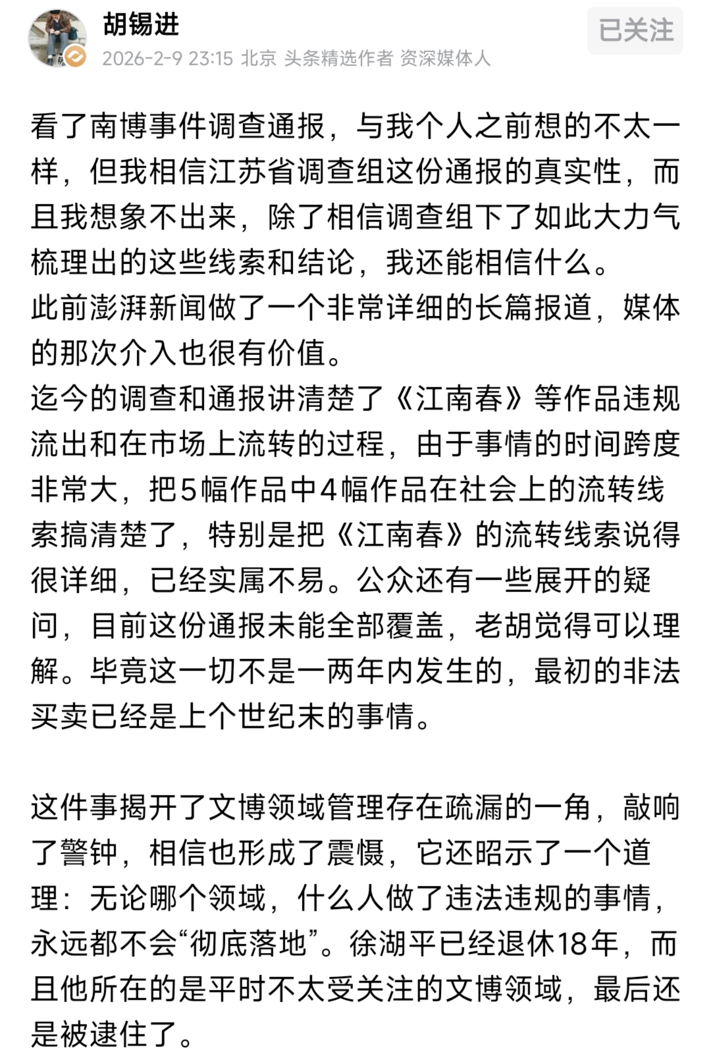 之前澎湃新闻做了详细报道,把这事推到了公众面前,后来江苏省调查组的通报,又把《江南春》等文物的流转线索一点点捋清楚了。虽然还有些疑问没完全说透,但能把这么多年的旧账翻出来,已经很不容易了。就像胡老师说的,除了相信调查组下大力气查出来的结果,我们还能信啥?