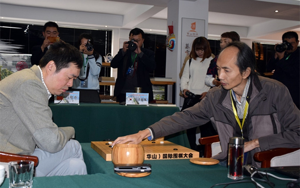 图为2019年4月福建福州,“博思杯”2019世界人工智能围棋大赛,弈小天对阵石子旋风。左一为林在范先生。