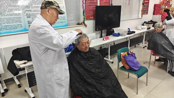 爱心义剪区,理发师耐心细致地为老年居民修剪发型,清爽利落的发型让老人们精神倍增,笑意盈盈。