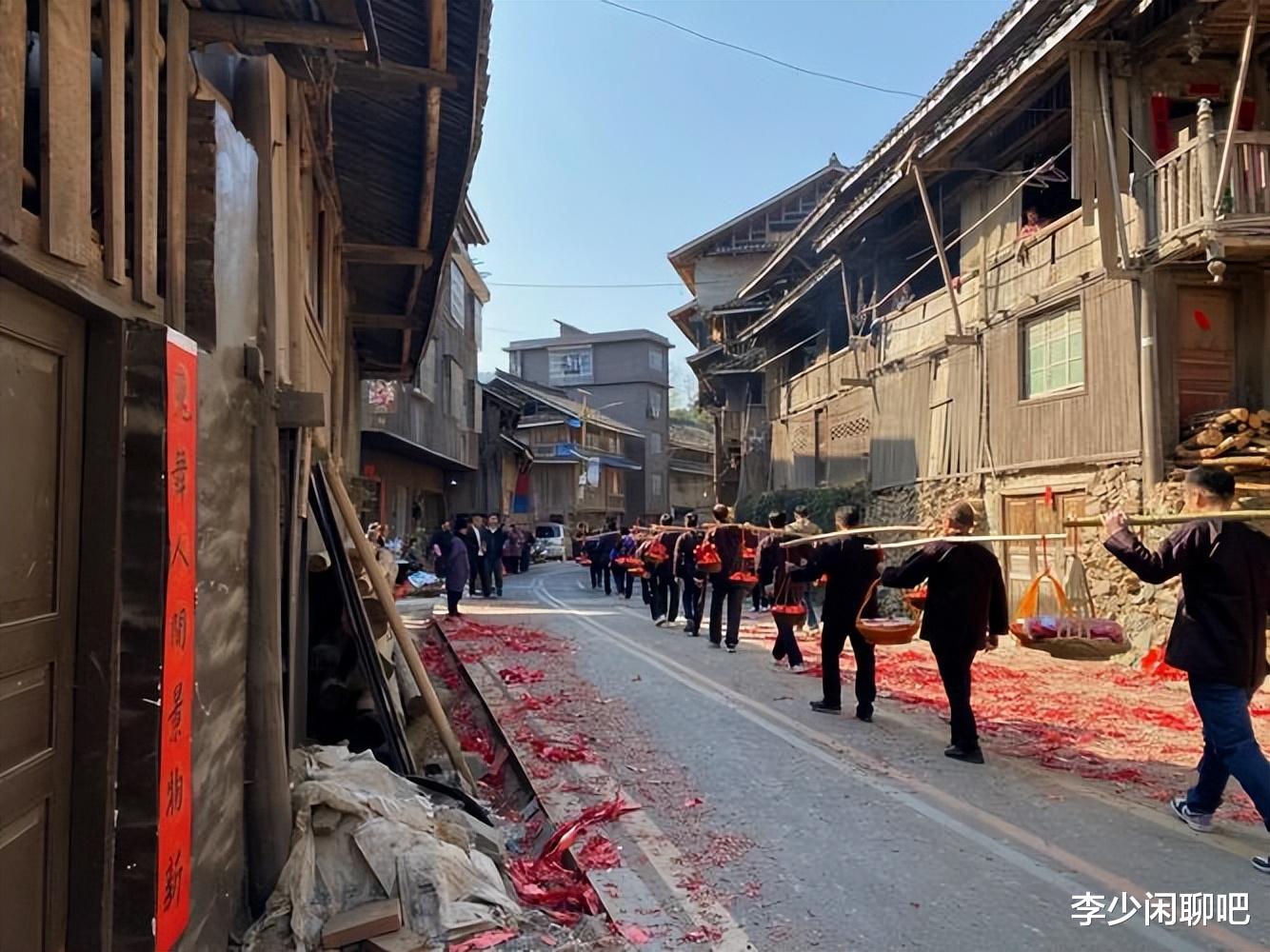 4. 侗族“新娘回门”在广西三江侗族自治县,春节期间会举行独具特色的“新娘回门”传统婚俗活动 。送亲队伍身着盛装,肩抬红猪、酸鱼、侗布、糍粑等贺礼,徒步从新郎家前往新娘家,尽展侗乡多彩风情。
