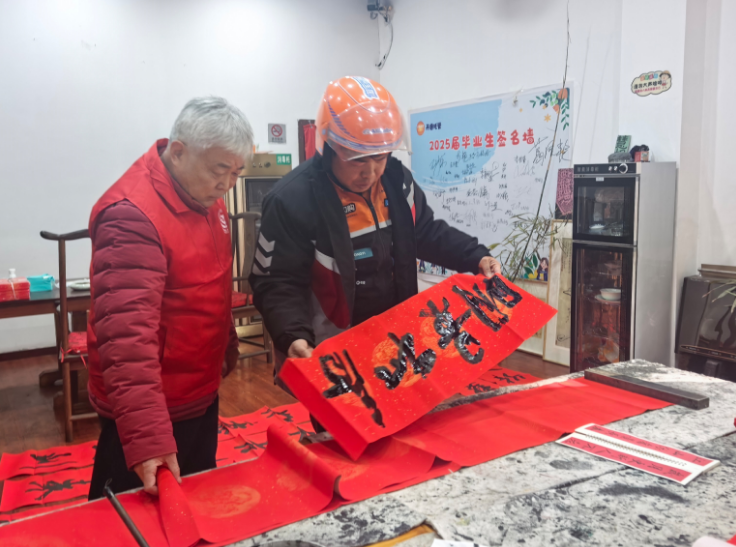 快递员、货车司机们围在桌前,有的请老师定制嵌名联,有的用手机拍下现场画面发给家人。“以前都是买印刷的春联,今年能拿到手写的春联,感觉年味更浓了。”网络主播汤静静举着墨迹未干的春联感慨道。