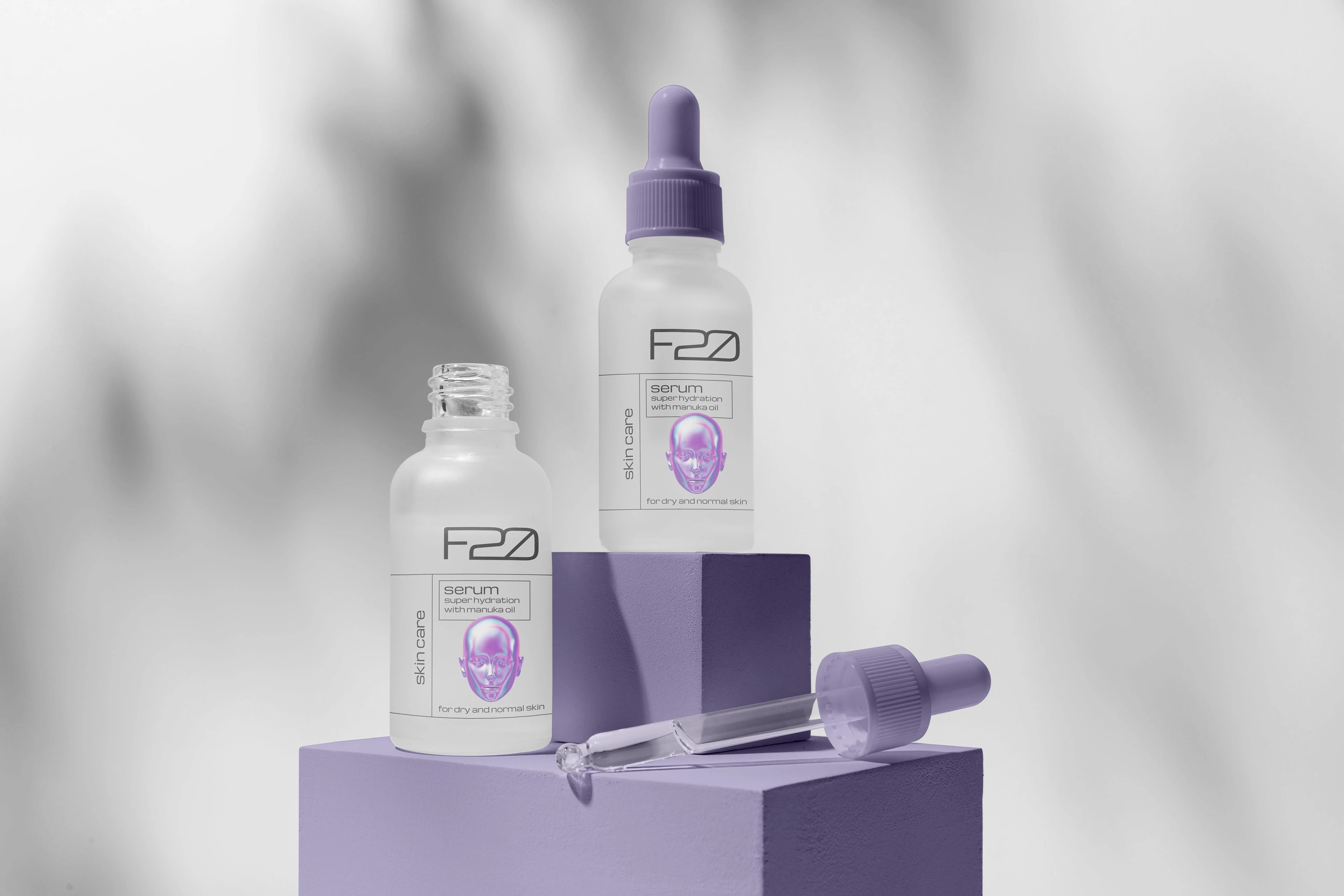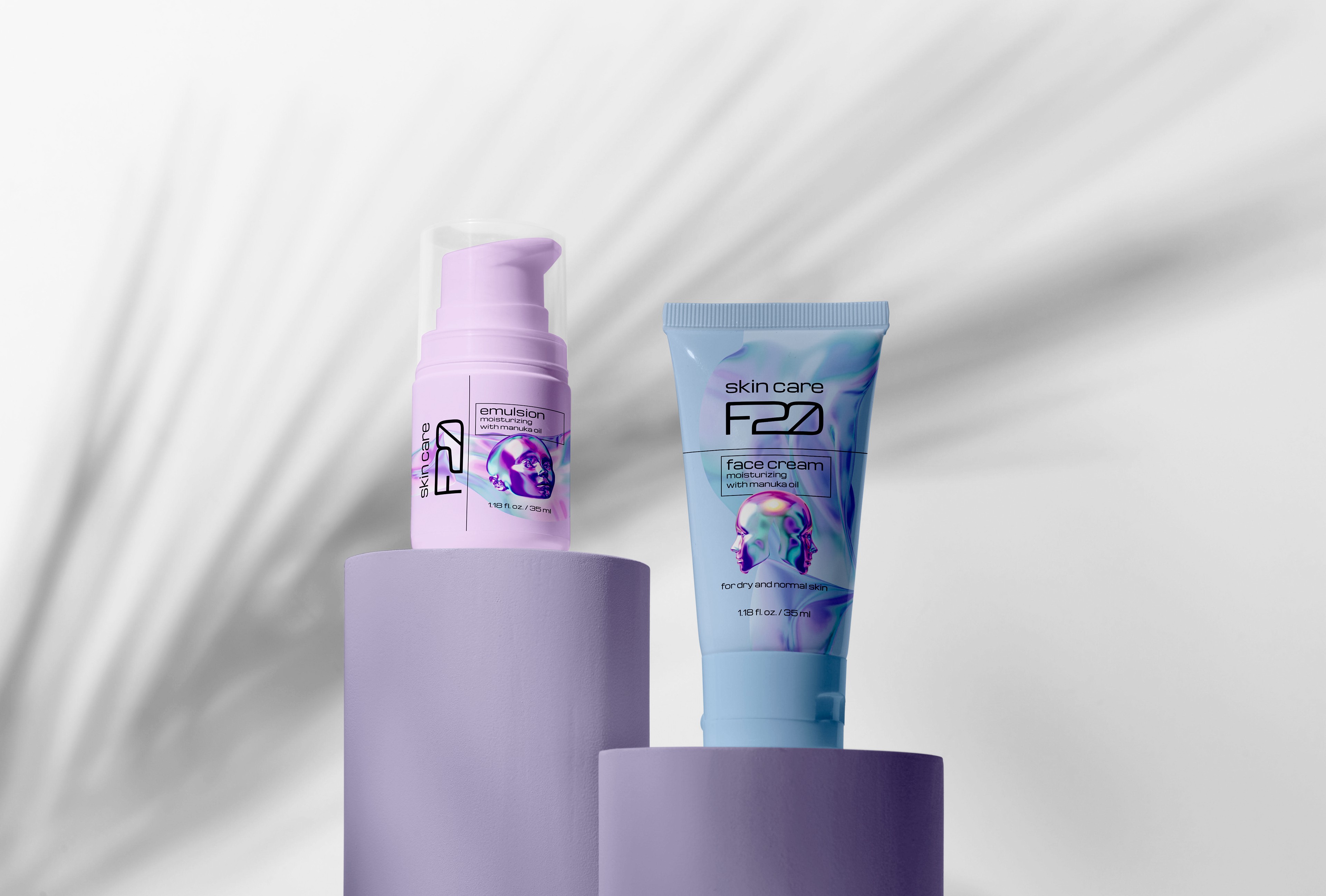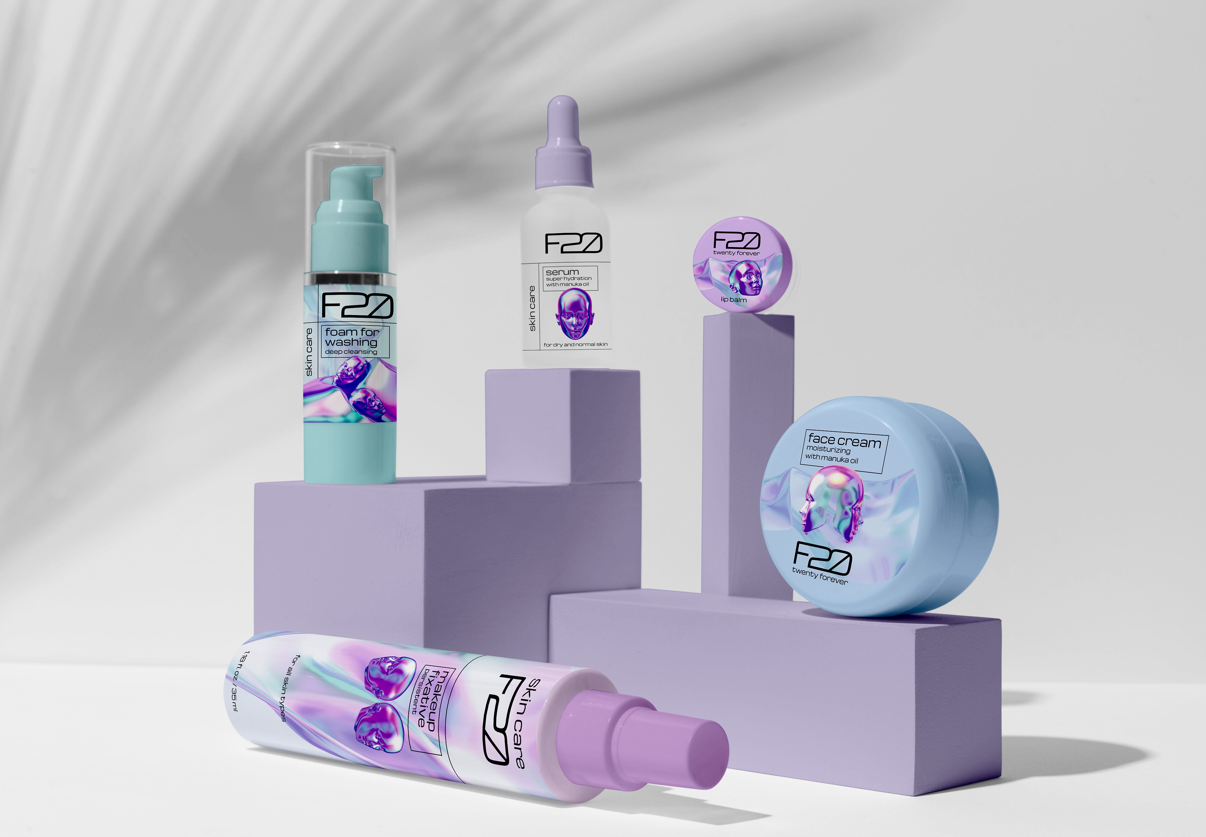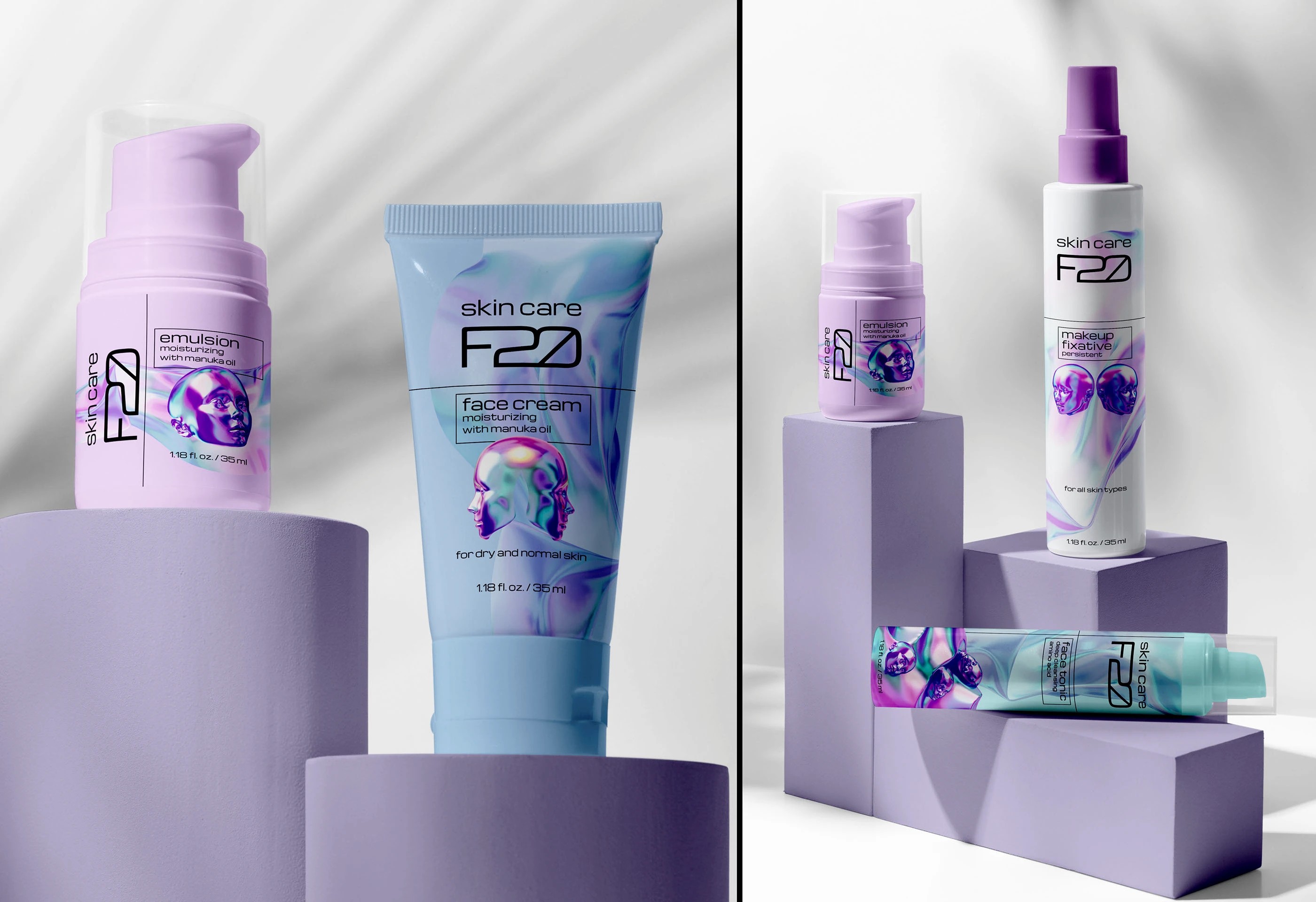 F20的包装设计则展现出另一种独特魅力。整体以淡紫色为主色调,营造出柔和、优雅且富有梦幻感的氛围。磨砂质感的瓶身搭配简洁的线条设计,尽显简约高级,给人一种精致、专业的印象,为简约的设计增添了科技感与时尚感。
