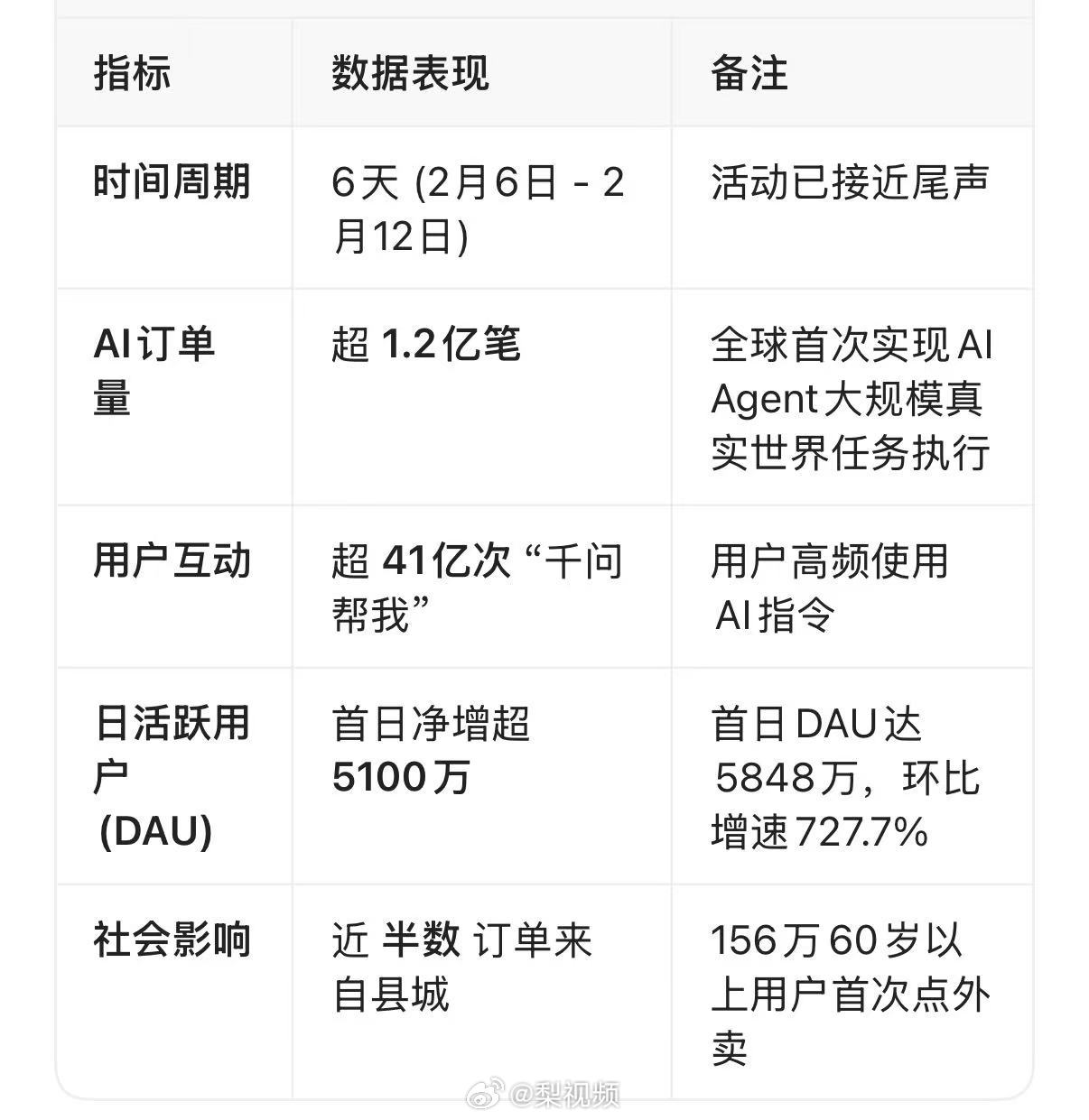 2026年2月12日,千问App披露“春节30亿大免单”第一波活动数据:过去6天,用户说了41亿次“千问帮我”,AI完成下单超1.2亿笔,近半数订单来自县城。