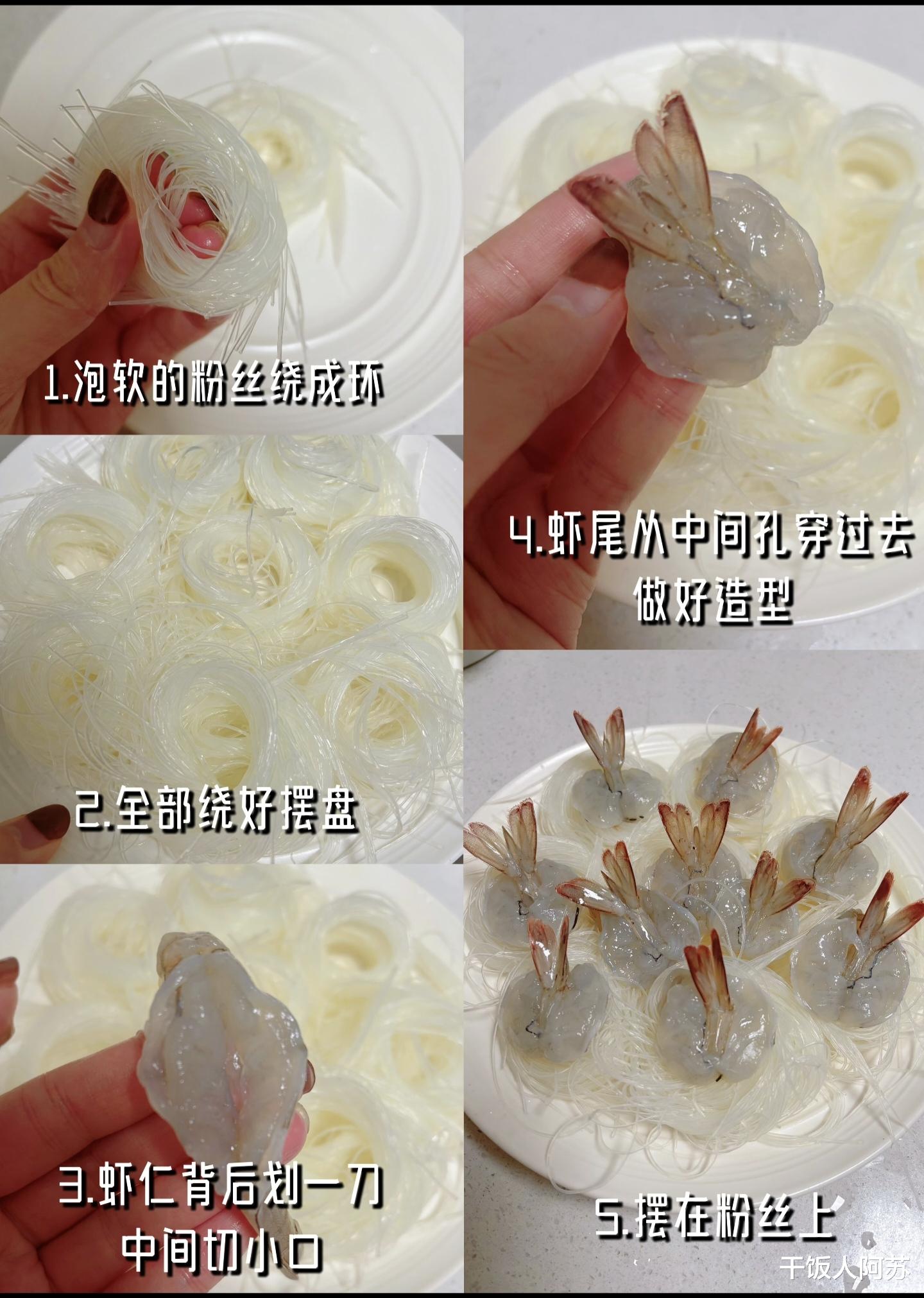 接下来是处理大虾。选择鲜活的基围虾,个头不用太大,但一定要新鲜。先剪去虾须和虾脚,然后从虾背处划开,注意不要切断,去掉虾线,再在虾身中间切一个小口。这样处理过的虾,不仅更容易入味,还能在后续的摆盘环节做出漂亮的造型。把虾尾从刚才切的小口中穿过去,一只开背虾的雏形就完成了。把处理好的虾,一个个摆放在粉丝环上,虾尾朝上,这样蒸出来的虾身卷曲,虾尾挺立,像一朵朵盛开的花,非常美观。