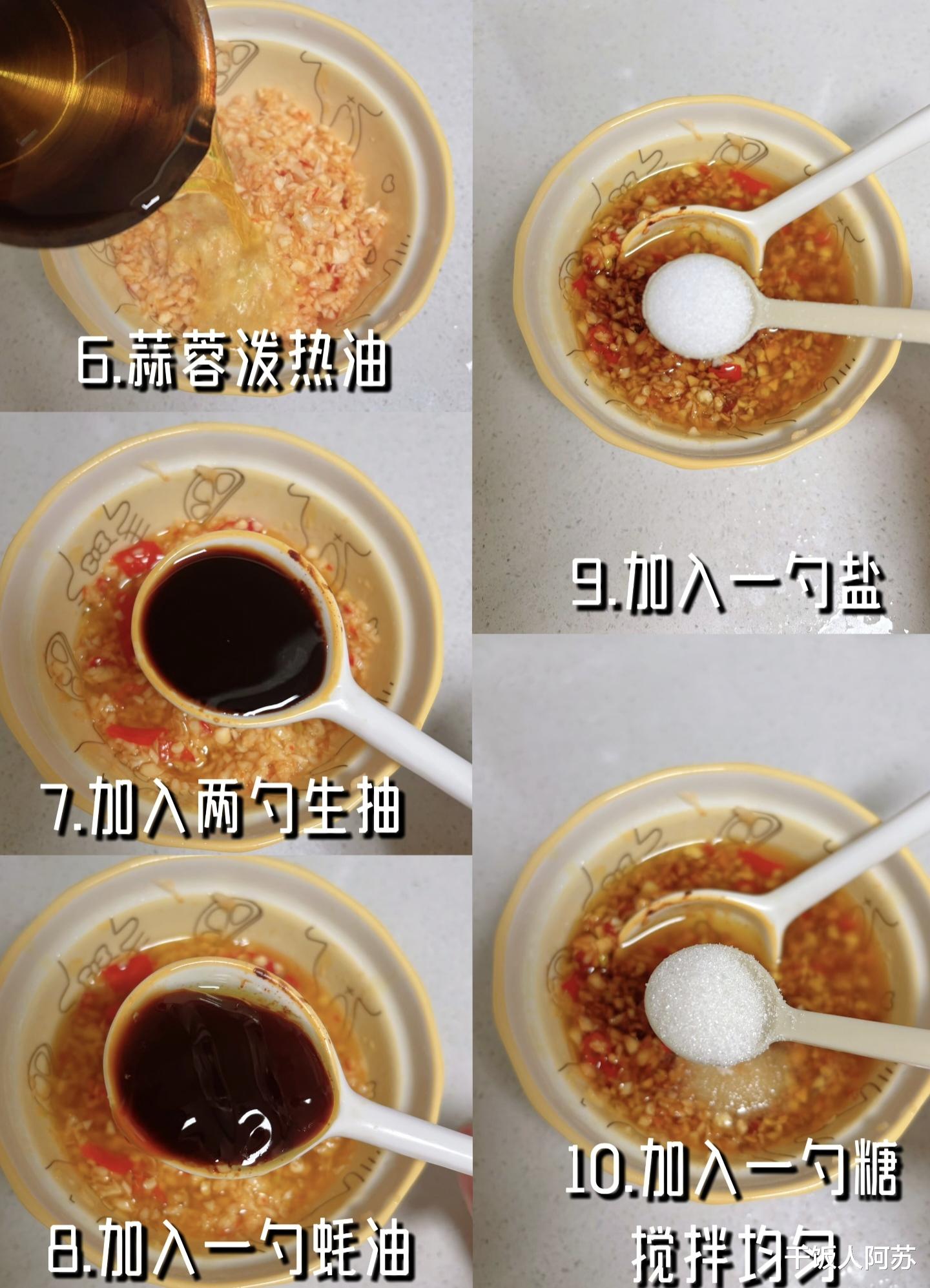 蒜蓉酱是这道菜的灵魂,也是成败的关键。准备大量的蒜末,再切一些小米辣碎增加风味。把蒜末和小米辣碎放进碗里,烧一勺热油,趁热浇在上面,“滋啦”一声,蒜香和辣椒的香气瞬间被激发出来。接着,加入两勺生抽、一勺蚝油、一勺盐和一勺糖,用勺子充分搅拌均匀,让所有调味料都融合在一起。这里的糖不要多,它的作用是提鲜,中和蒜蓉的辛辣,让整体味道更加醇厚。
