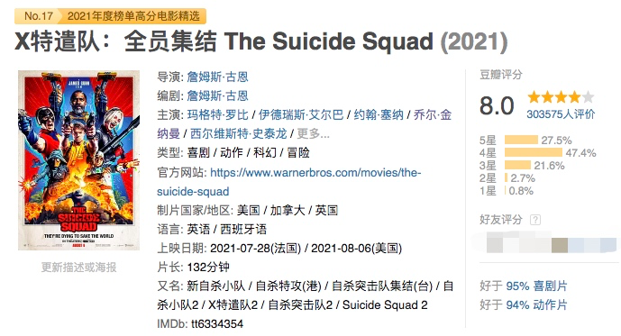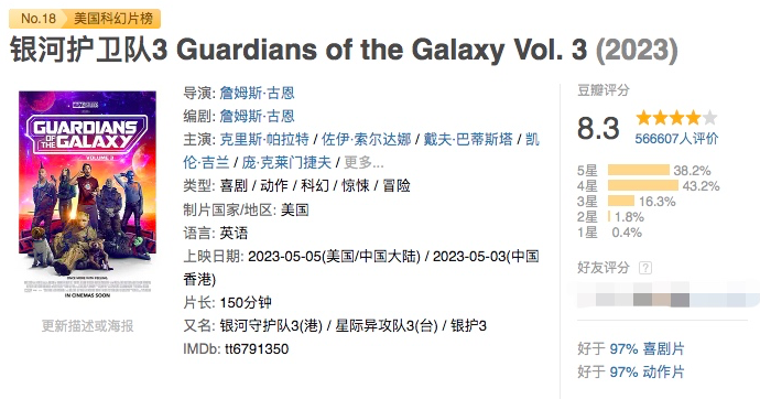 比如漫威的《银河护卫队》系列,即便在“后《复联》时代”,《银河护卫队3》也没掉链子。你很难想象一部2023年上映的漫威电影,豆瓣评分还能高达8.3。