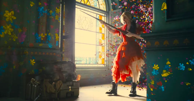 《X特遣队》中,小丑女越狱时手撕守卫小兵,喷洒的血浆却在空中散落成了花瓣雨。