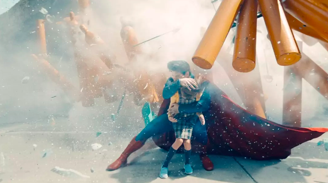 又比如,超人这样一个有着非凡力量、正义感和同理心的超级英雄,在以往的系列电影中几乎是被当作“神”来塑造。