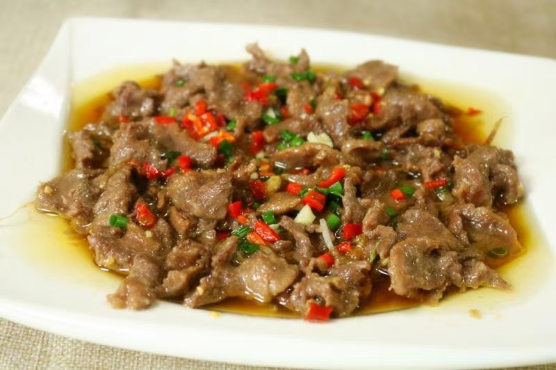 葱油鸭胸肉:另一块鸭胸肉不炸不炒,切片后铺在盘里,淋上滚烫的葱油,葱香瞬间裹住鸭肉,口感嫩滑,没有一丝柴味,清淡却不寡淡,配米饭能多吃半碗;