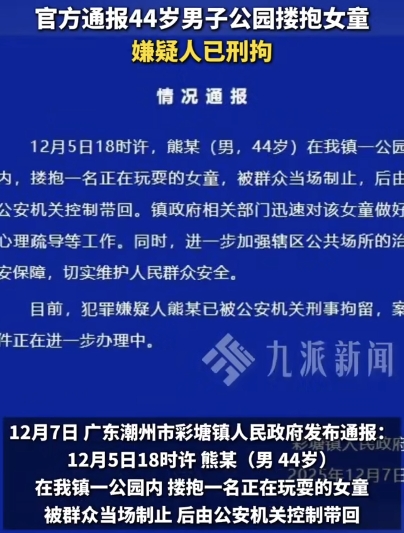 广东潮州彩塘镇最近出了件让人气愤到极点的事儿!12月5日傍晚6点左右,在彩塘镇的一个公园里,大家本来都开开心心地享受着休闲时光,孩子们在旁边欢快地玩耍。可谁能想到,一个44岁的男子熊某,竟然干出了令人发指的事儿——他公然搂抱一名正在玩耍的女童!这场景,光是想想就让人觉得毛骨悚然。