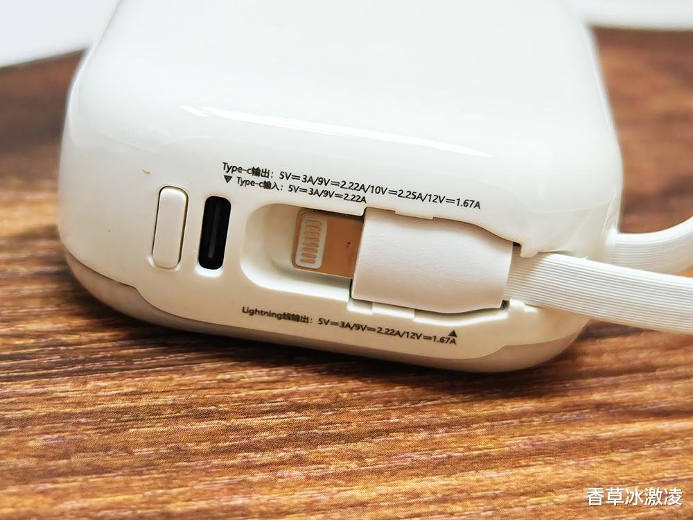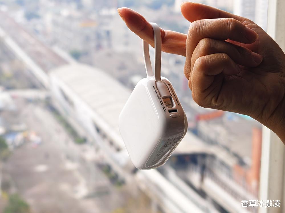 最亮眼的设计当属机身侧面集成的双充电线——Lightning和Type-C接口双线自带,线体可自由抽拉,不用时能完美嵌入机身凹槽,既不会缠绕杂乱,还能充当手绳使用,拎起就能走,彻底解决了“带宝忘线”的老大难。
