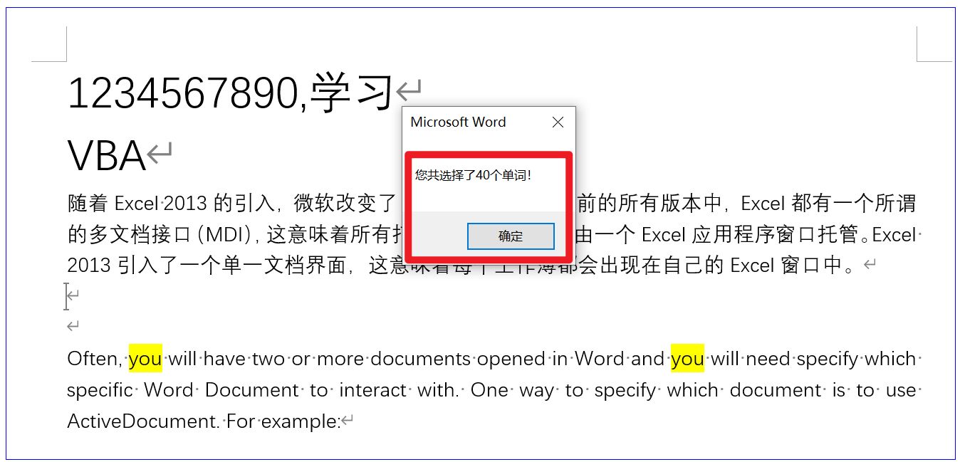 MsgBox "您共选择了" & Selection.Words.Count & "个单词!"