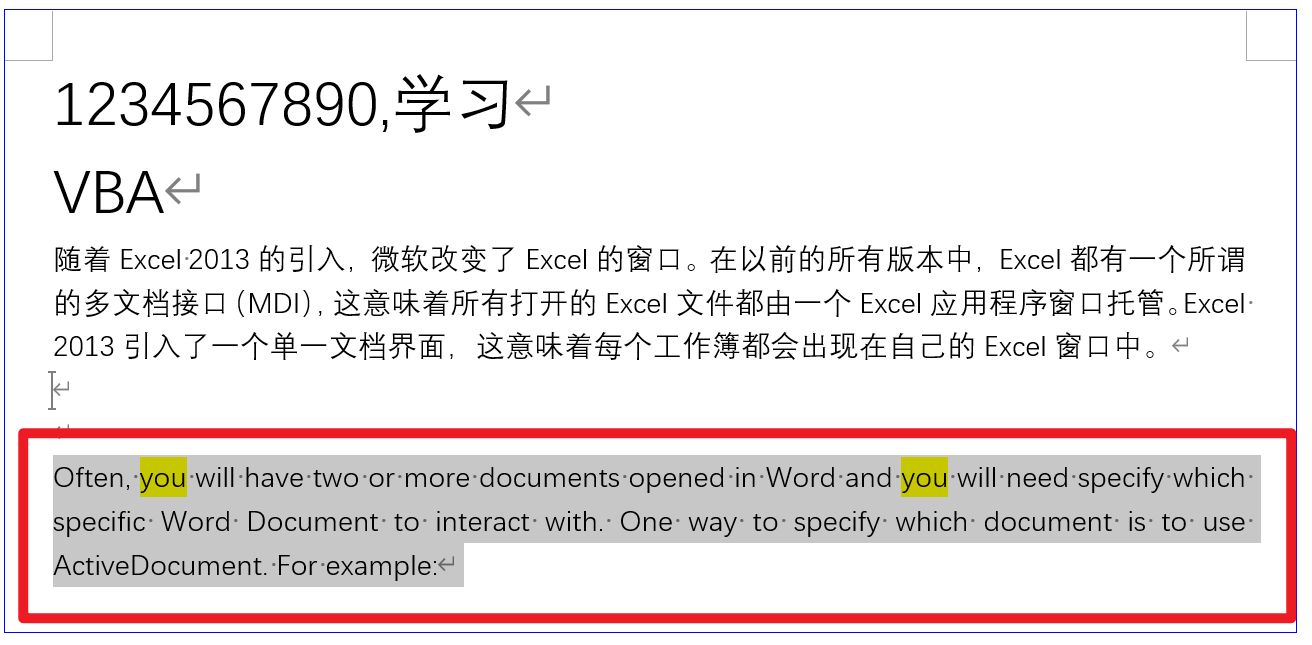 我们将首先选择上面的红色框选部分,然后再统计一下这部分区域的单词数量,最后我们将上述黄色单词you删除。为什么要是英文区域呢?因为单词(word)是英语的范畴。所以我们用英文进行测试。