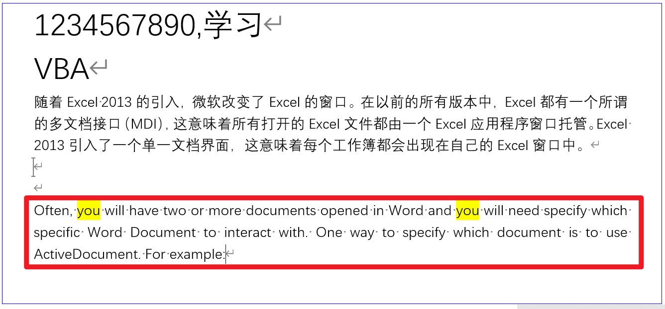 Words 集合中包含的文档中的标点符号和段落标记。3 利用Document.Words属性删除某单词下面我们讲解一个实例,这个实例利用Document.Words属性来统计所选择区域的单词及删除某单词的方法。下面我们先看看当前文档的截图: