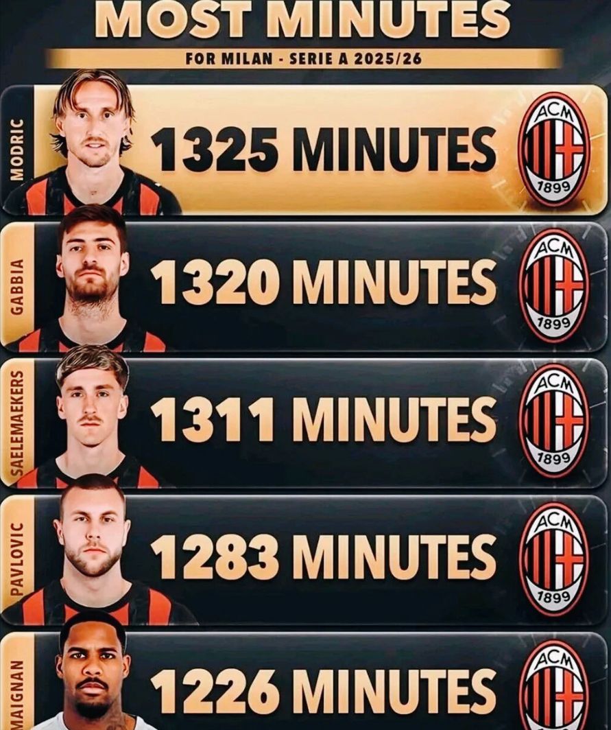 赛季踢到现在,莫德里奇用一个最直接、也最难反驳的数据,把所有“养老论”推翻——他是AC米兰队内出场时间最多的球员。