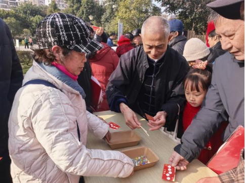 10时20分,游园互动区五大点位准时开放,“集五福・兑好运”趣味升级,居民开启“集福模式”。猜灯谜区,大家凑一块儿琢磨,猜中就乐颠颠拿“智慧福”;福气套圈区,大人小孩排着队套福袋,套中瞬间欢呼雀跃,揣上“平安福”;新年夹元宝和福运翻翻乐区,居民各展身手“大显神通”;茶香辨辨乐区,居民闭眼轻嗅辨茶,轻松拿走“品味福”。志愿者耐心引导、认真盖章,现场秩序井然。集齐5枚福章的居民到兑奖区换新春好礼,笑容灿烂。
