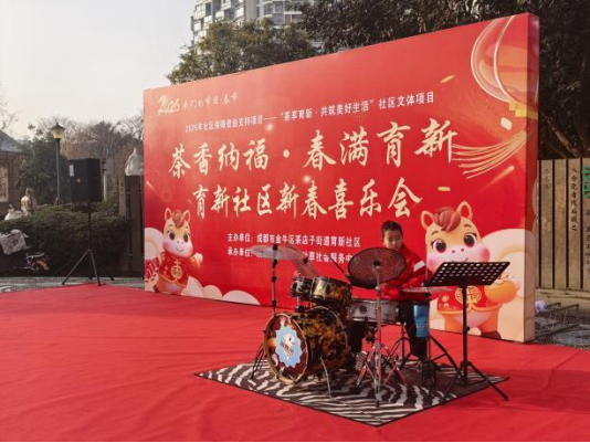 9 时 30 分,主持人热情开场,清晰介绍了活动规则,随后育新社区党委书记冯茂军书记送上新春寄语,温馨的话语里满是对辖区居民的美好祝福,让现场暖意融融。9 时 40 分,文艺表演准时开演,7个精彩节目轮番登场,瞬间点燃现场氛围。舞之韵艺术舞队队员身着盛装,带来舞蹈《红红的灯笼挂起来》,火红的舞姿伴着欢快的旋律,将新春的喜庆氛围拉满;邱语诺小朋友献上歌曲《梨花又开放》,清澈童声治愈又动听;太乙龙珠队的健身舞《鲜红的太阳永不落》动作舒展大气,尽显风采;杨乐凡的架子鼓独奏《离别开出花》节奏铿锵,鼓点声声引得台下阵阵喝彩;交谊舞队的《望月》温婉优美,尽显社区居民的别样风采;邹慕曦小朋友演唱《如愿》,纯净歌声在广场上空回荡;茶店子曳步舞团的《战马》动感十足,舞步轻快利落,台下观众跟着节奏拍手叫好,掌声、欢呼声此起彼伏,不少居民拿出手机拍照录像,定格这欢乐的瞬间。