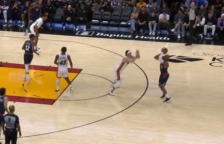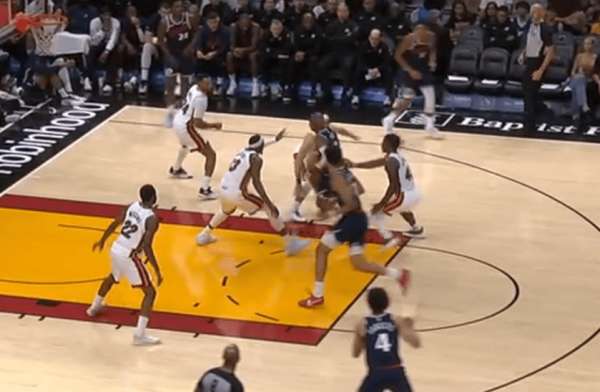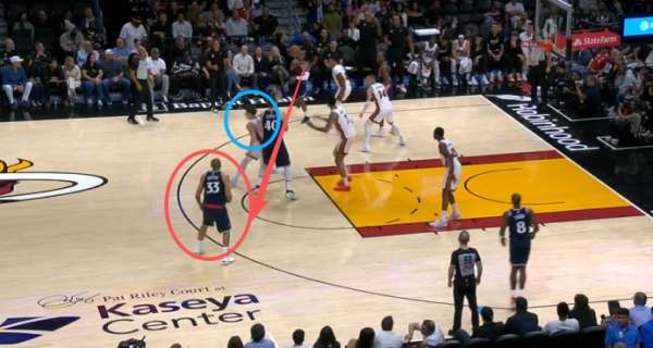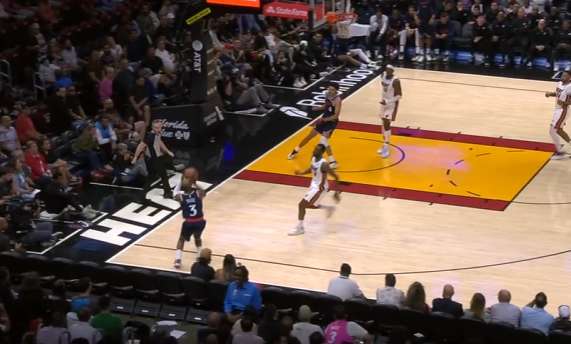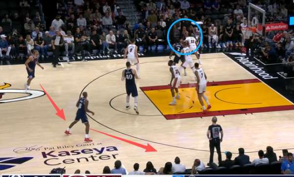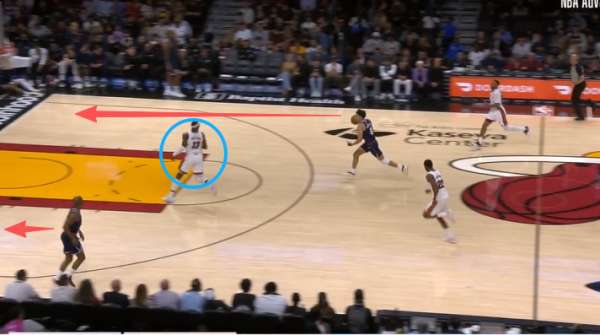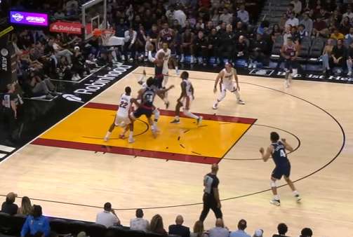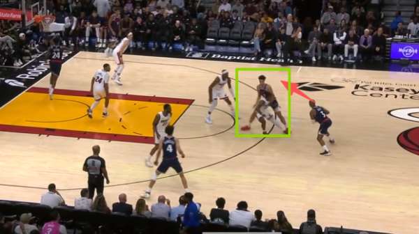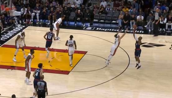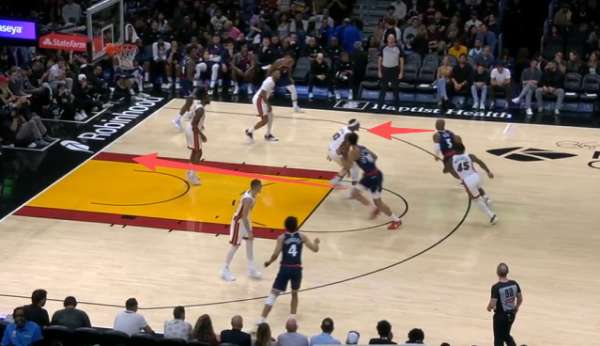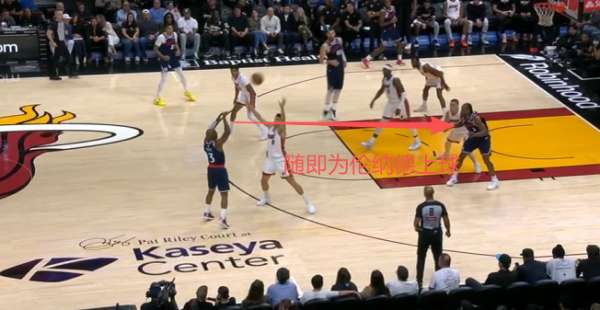 保罗底角持球吸引热火防守注意力,与此同时无球端的邓恩、巴图姆沿三分线逆时针空手移动。