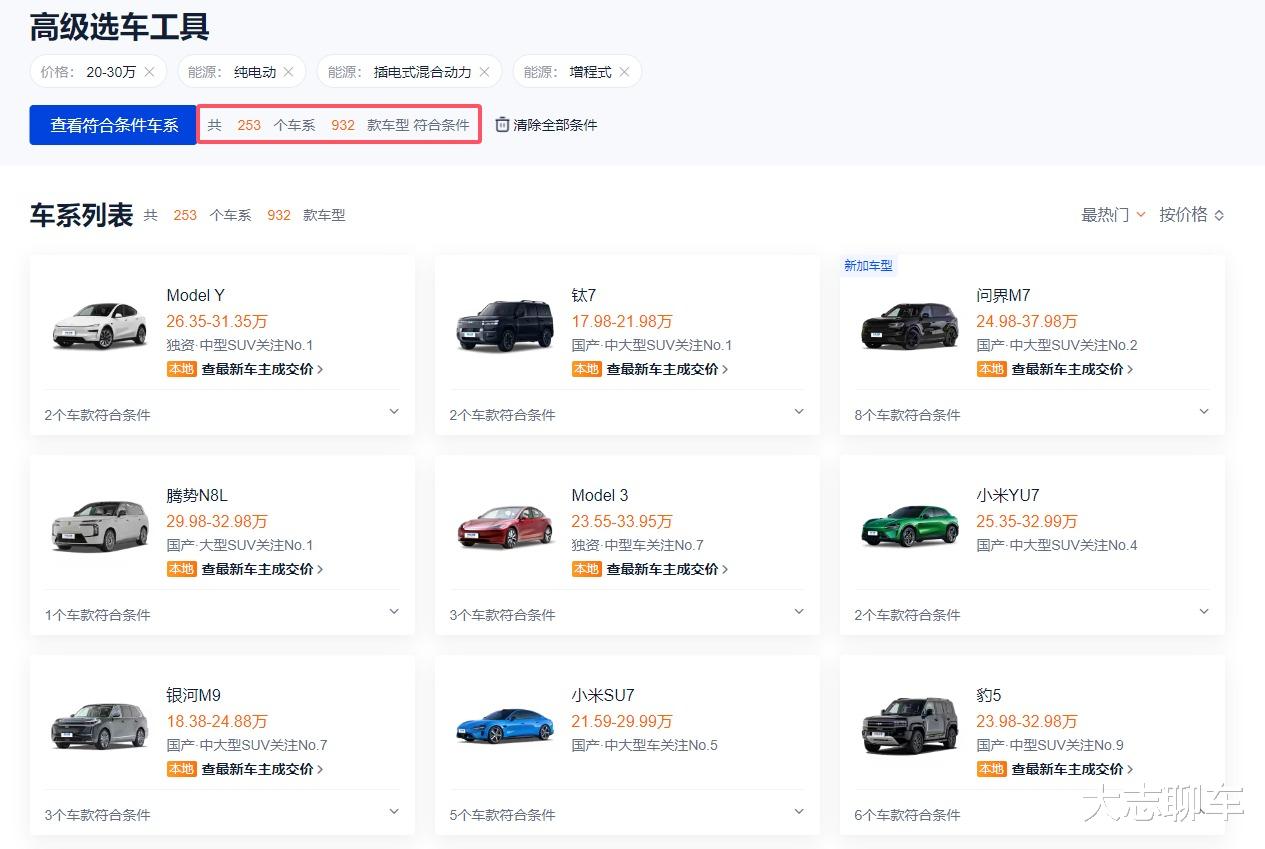 到底竞争有多激烈呢?我们直接输入20万到30万这个价位,并且能源类型是新能源,足足搜出来了253个车系,车型更是达到了932款,排名靠前的那些车型,还都是我们的老熟人,像比亚迪的钛7、腾势N8L、豹5,小米的SU7和YU7,问界M7和特斯拉得MODELY和MODEL3等等,可以看出来,这些车型都是各家车企的实力展示。