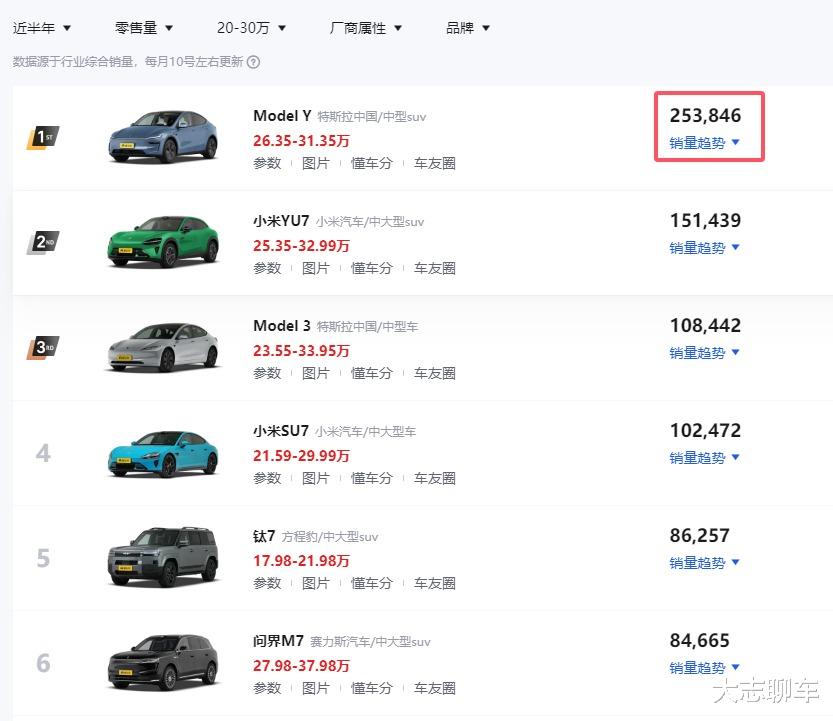 再然后,就是销量情况了,这个市场同时也是最激烈的,一旦你不行了,立马就会有其他车企上来补位,现在看着是特斯拉的model Y是销量最好的,近半年来,可是,你足够细心会发现,一直紧随其后的小米YU7已经快要赶超他们了,很快,隔壁钛7也正在发力之中,因此,你会看到一件事情,接下来,就是各大车企之间的厮杀。