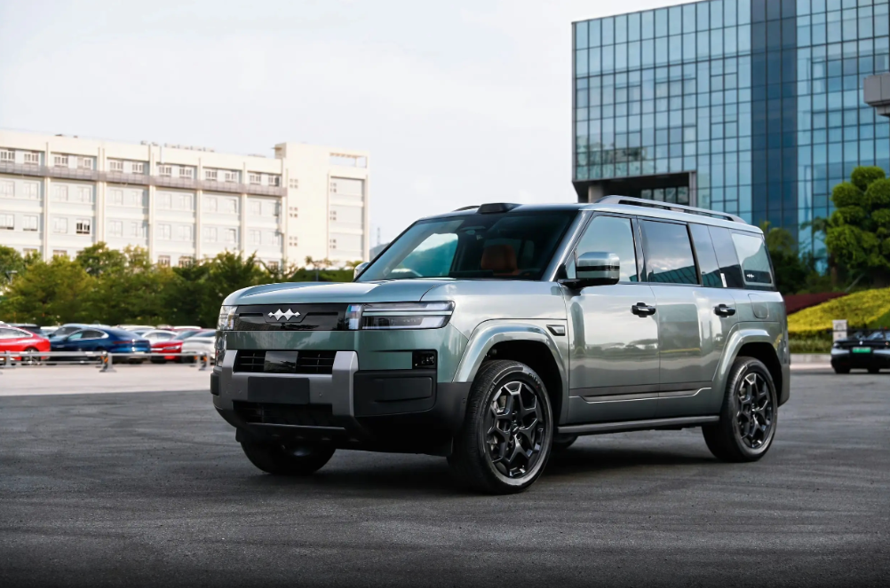 侧面线条硬朗简洁,车顶带有行李架,车门带有常规的外置式门把手,加上脚踏板、突出的轮眉,硬派风格十足。尺寸方面,方程豹钛7纯电版长宽高分别为4999/1995/1865mm,轴距为2920mm,接近角/离去角分别为23/25度,也和现款车型基本一致。