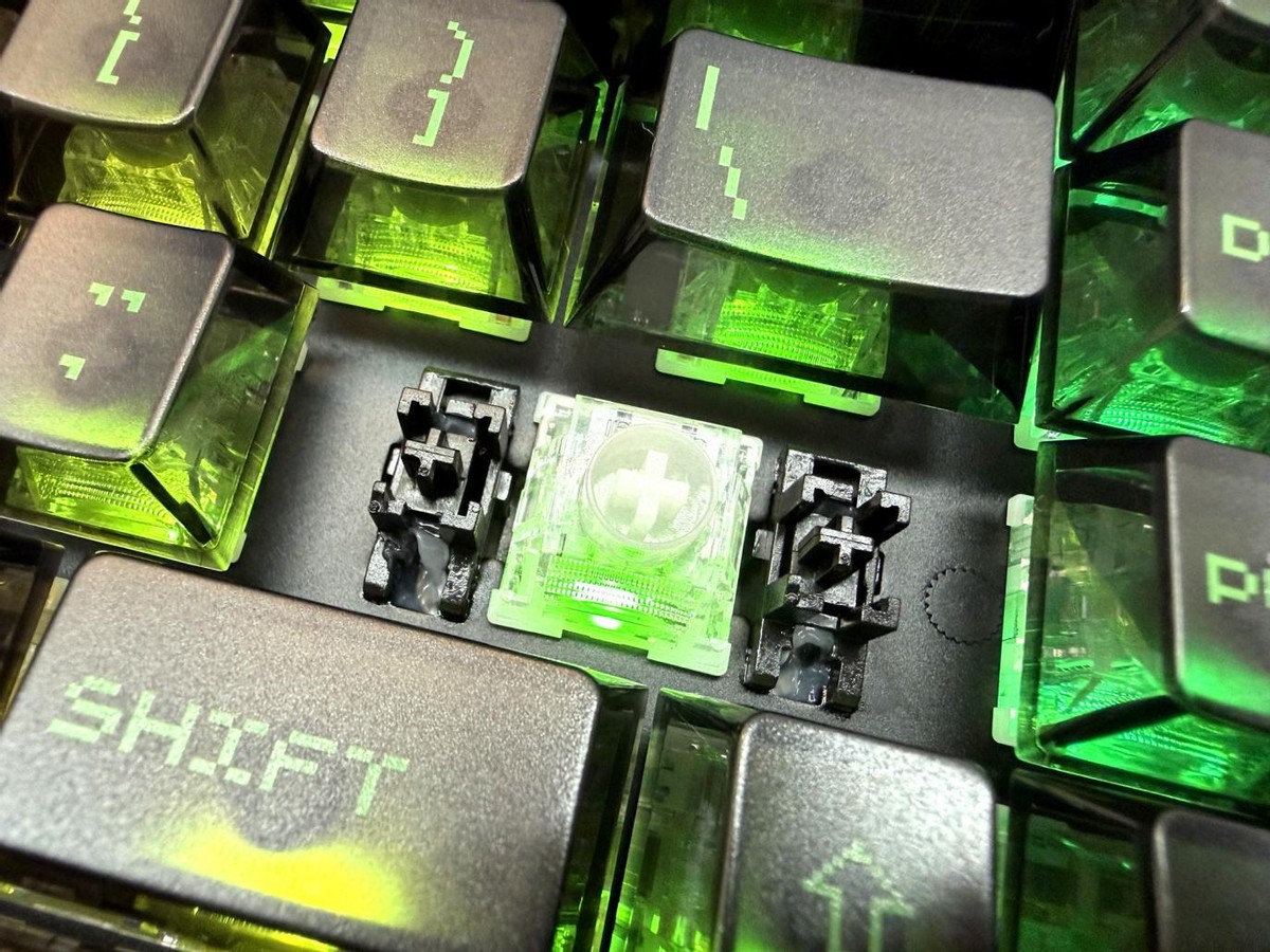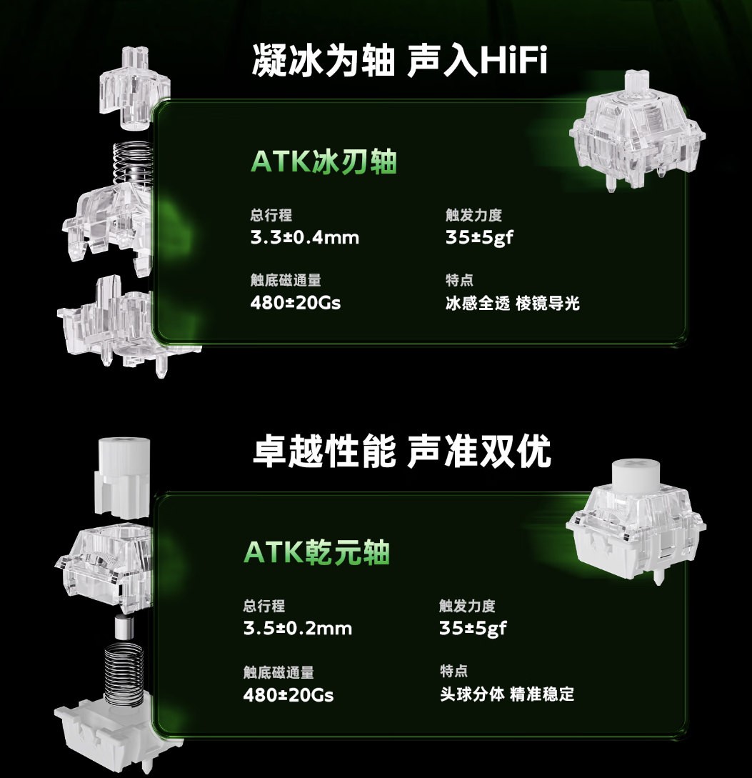 ATK RS6 AIR有冰刃轴和乾元轴两种轴体供用户选择。冰刃轴创新采用高透光棱镜导光柱设计,将视觉、听觉与触觉完美融合,棱镜导光营造炫酷视觉灯光,HIFI麻将声提供悦耳听感,车规级精度保障稳定手感,真正实现高性能与舒适度的统一。