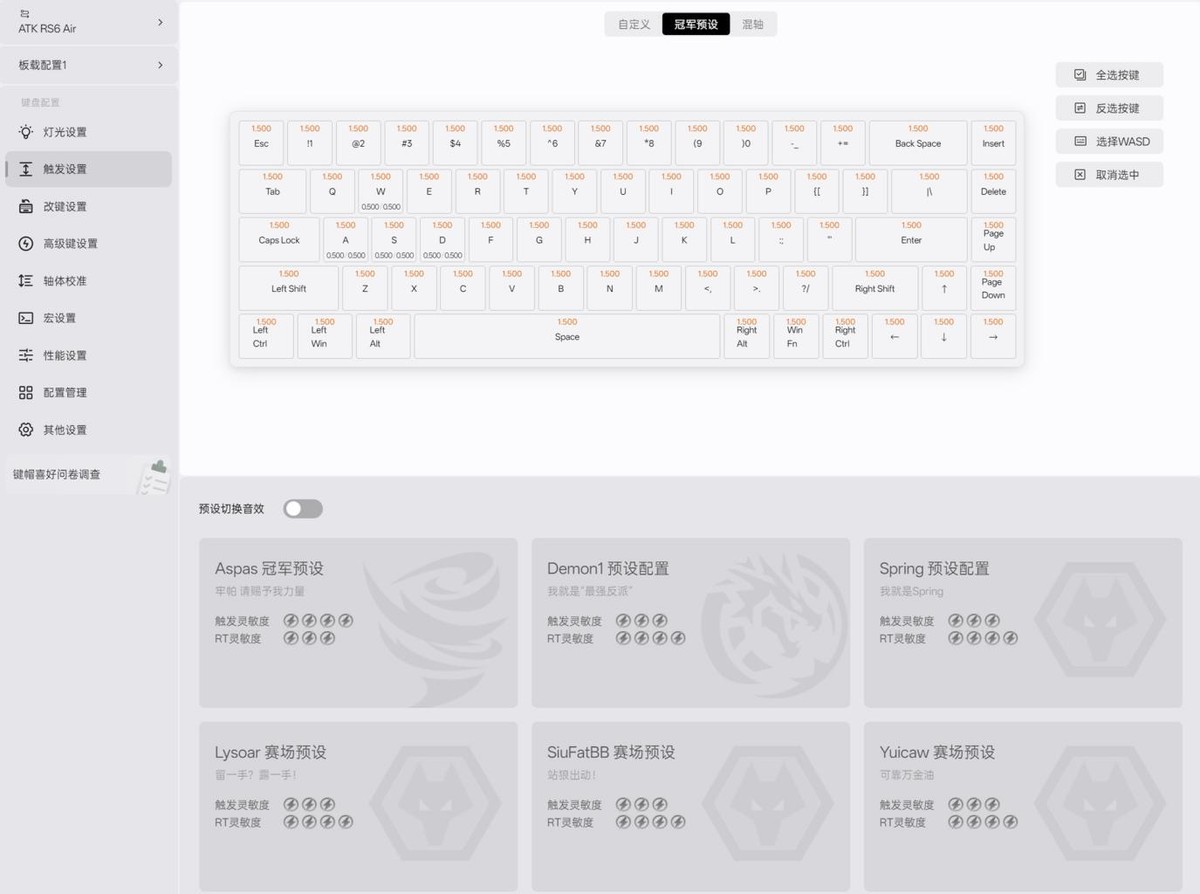 如果不想调试可以直接载入冠军预设,直接领略游戏王者的键盘体验,这个功能真的是非常贴心。