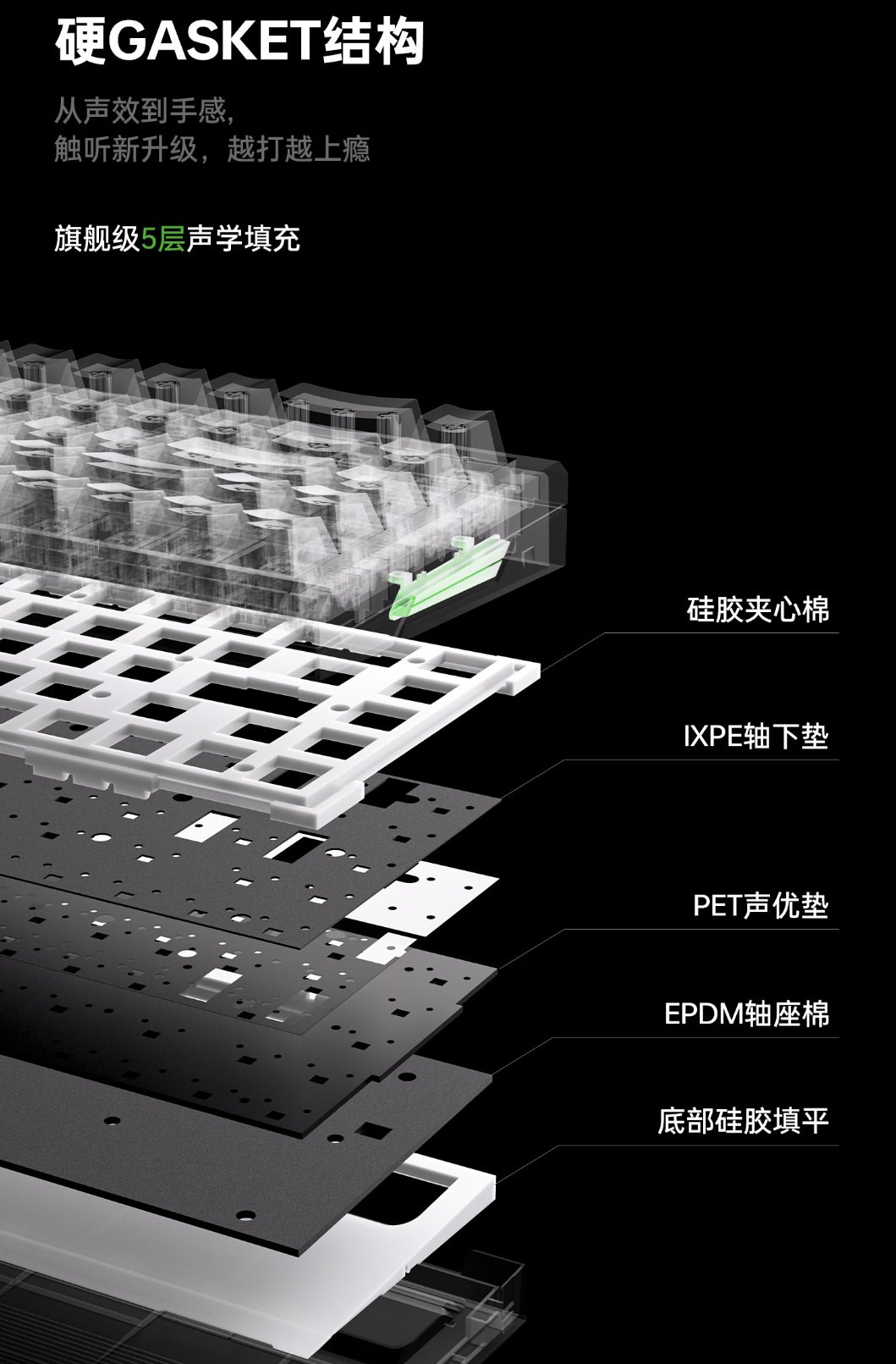 一款优秀的磁轴键盘,不仅要性能强悍、颜值出众,手感与听感同样重要。ATK RS6 AIR 采用硬 GASKET 结构设计,搭配由硅胶夹心棉、IXPE 轴下垫、PET 声优垫、EPDM 轴座棉、底部硅胶填平组成的五层声学填充系统,手感软弹,声音HIFI醇厚,每次敲击都带来令人愉悦满足感。重新定义了百元键盘的手感与听感天花板。