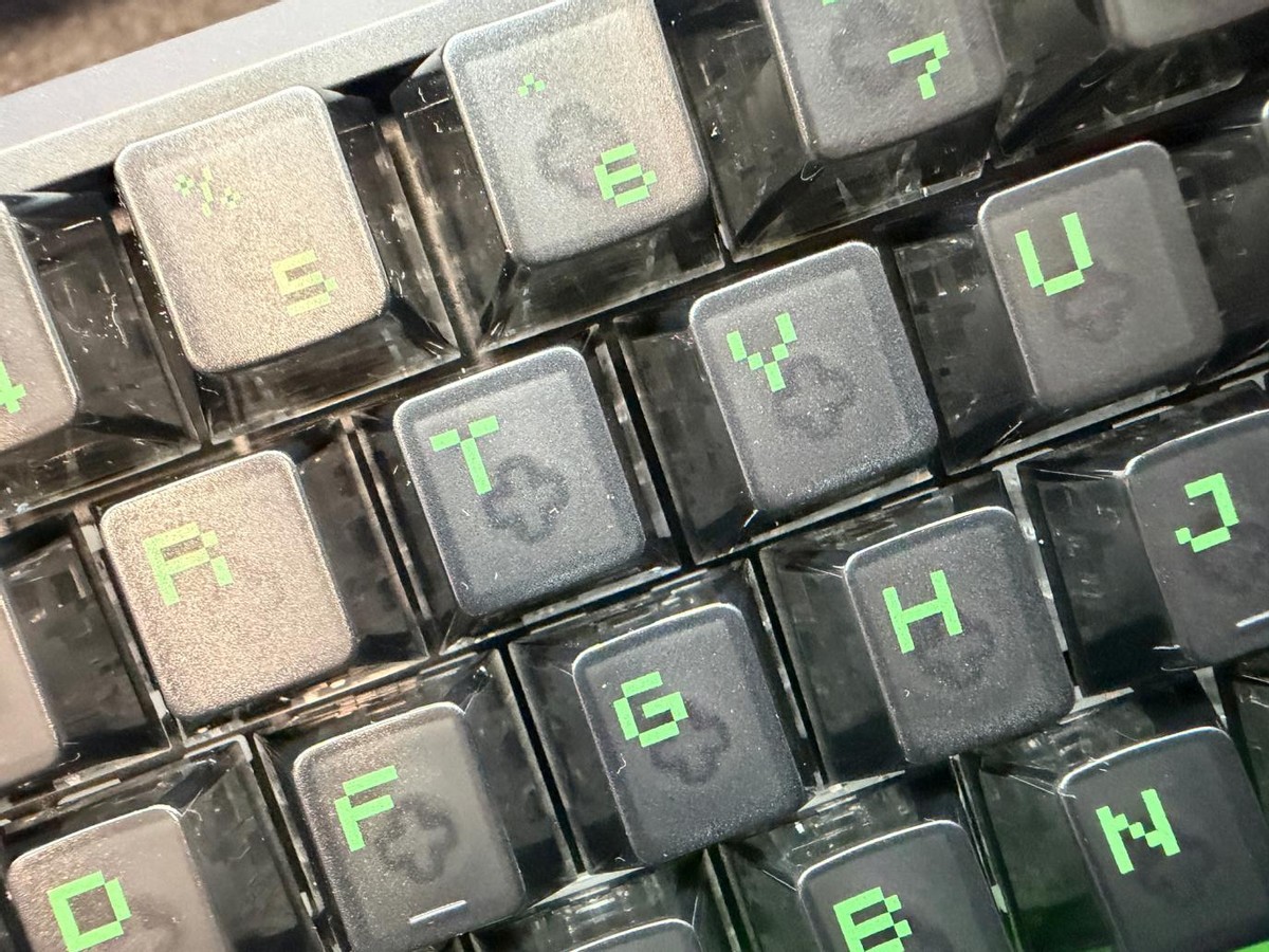 为了让光效更具质感,键盘采用了高透雾面 PC 材质的像素大字符键帽,顶部雾透设计能够让光线柔和均匀地散发出来,避免了强光刺眼的问题,同时磨砂触感不仅带来了舒适的握持感,还能有效抵抗打油,即使长时间使用,键帽也能保持洁净如新。