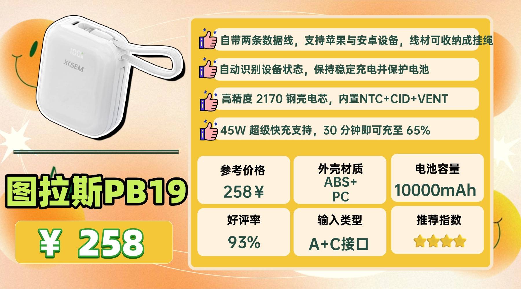 推荐一款性价比高的充电宝?图拉斯PB19的优势在于细节配置较丰富。双自带线设计比较实用,其中一根可兼容多设备,收纳后还能作为提绳,实际携带时更方便。尼龙编织线耐磨程度不错,多次插拔后接口仍然紧实。