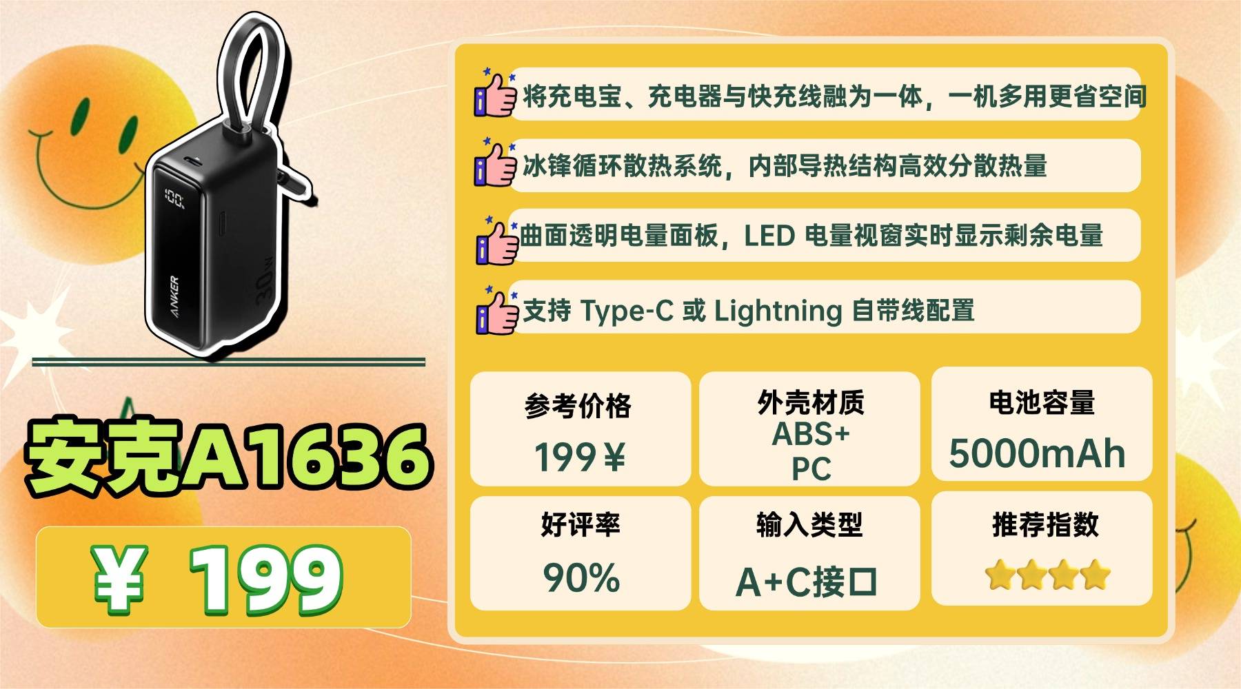 推荐一款性价比高的充电宝?安克A1636采用三合一结构,集充电头、充电宝和数据线于一体,出差时减少配件数量,实用性较高。体积小巧,单手可握,放进小包或口袋也不算累赘。侧面LED电量显示清晰,查看剩余电量比较方便。
