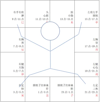 每一个地支都代表了一个时辰,也代表一条经络,中医叫做子午流注。除了经络外,十二宫位也可以看做是一个人平躺在盘上,头部就是上面中间的位置,还有左手右手,左脚右脚。